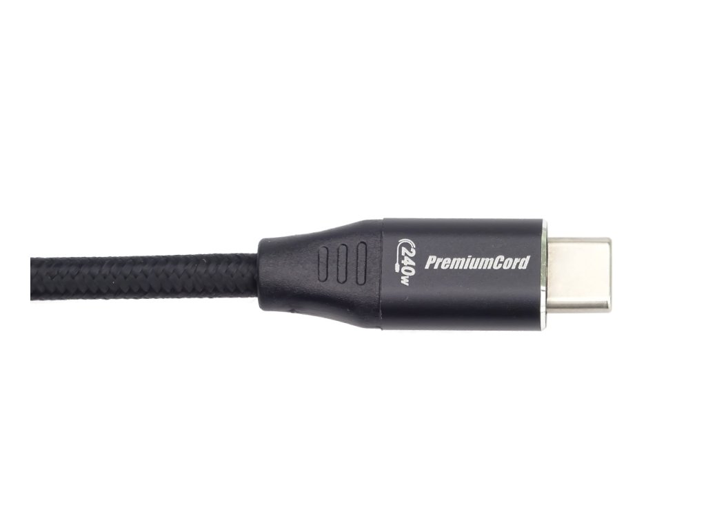 PremiumCord Kabel USB-C M/M, 240W 480Mbps černý bavlněný oplet, 0,5m*Speciálně navržený kabel pro maximálně výkonné nabíjení nebo napájení přes USB-C až 240W