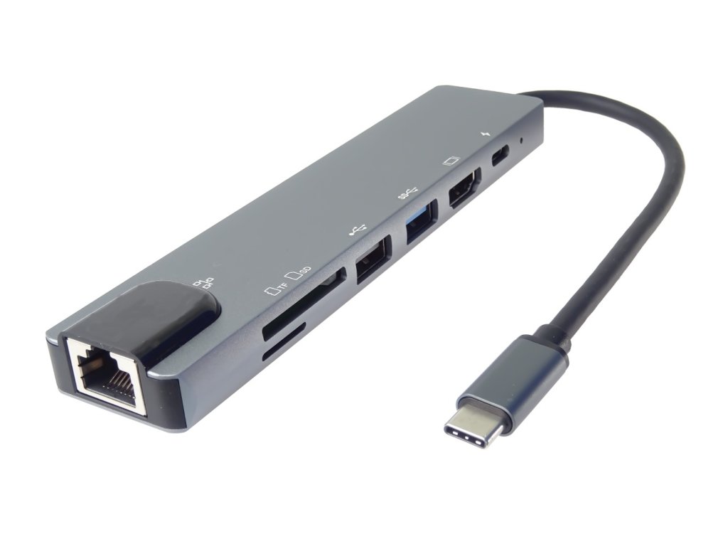 PremiumCord USB-C na HDMI + USB3.0 + USB2.0 + PD + SD/TF + RJ45 adaptérTento adaptér umožňuje vysoce kvalitní převod videa a zvuku z USB-C konektoru na HDMI konektor pro další monitor/TV/projektor. Funguje jako externí grafická karta.
