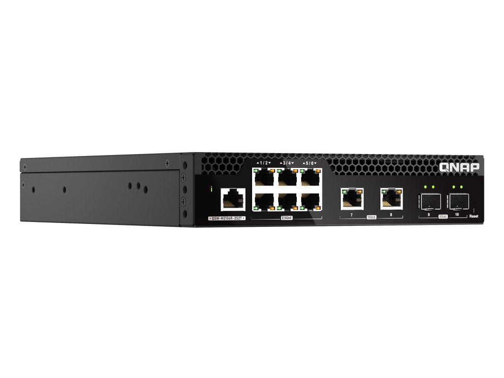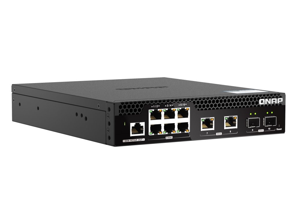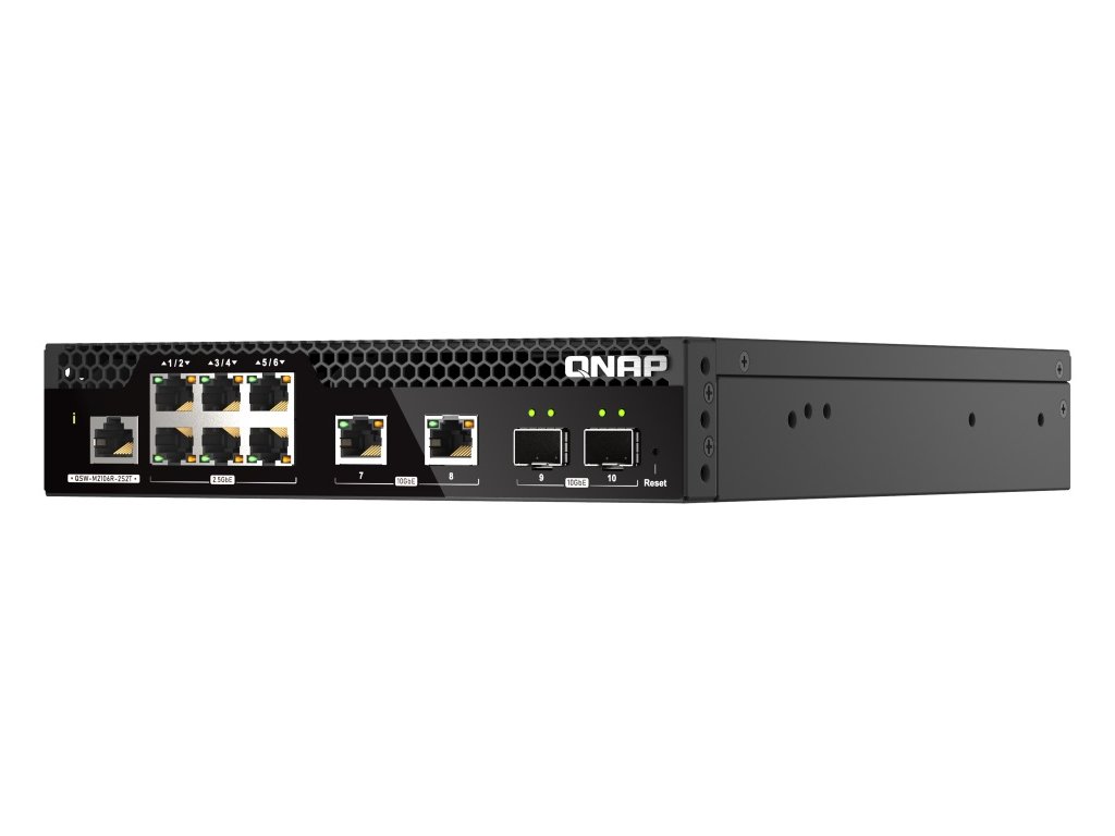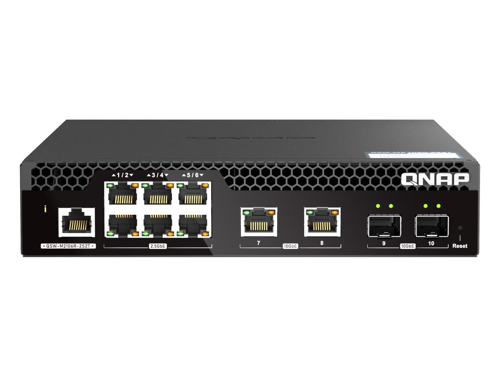 Zařízení QSW-M2106R-2S2T je webově řízený přepínač (switch) úrovně 2 se dvěma porty 10GbE SFP+, dvěma porty 10GbE RJ45 a šesti porty 2,5GbE RJ45. Zařízení QSW-M2106R-2S2T podporuje přepínání a správu sítě úrovně 2 (L2) prostřednictvím uživatelsky vstřícného webového rozhraní, nabízí flexibilní nasazení v hybridních vysokorychlostních síťových prostředích a poskytuje řešení pro správu sítě na základní úrovni, které zvládnou používat i ti, kdo nepatří mezi profesionály v oboru IT. Díky konstrukci s poloviční šířkou mohou být dva QSW-M2106R-2S2T instalovány do 1U rackového prostoru.
