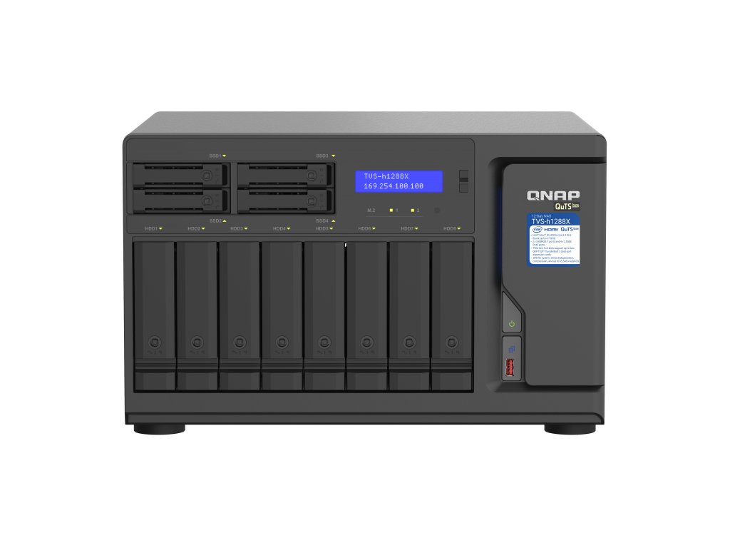 Vysokokapacitní TVS-h1288X je vybaven výkonným procesorem Intel® Xeon® W a umožňuje instalaci dvou rozšiřujících karet QNAP QXP-T32P Thunderbolt™ 3 PCIe (prodává se samostatně) pro dosažení čtyř portů Thunderbolt™ 3, což z něj dělá perfektní doplněk pro Thunderbolt Uživatelé Mac® a Windows® s vybavením pro vysokorychlostní spolupráci médií. Integrované připojení 10GbE a 2,5GbE podporuje Port Trunking a failover, aby dále uspokojily podnikové aplikace náročné na šířku pásma a spolehlivost. TVS-h1288X běží na operačním systému QuTS hero založeném na ZFS a podporuje deduplikaci a kompresi vložených dat na úrovni bloků, téměř neomezené snímky, technologii SnapSync v reálném čase a mezipaměť pro čtení / zápis, což vašemu podnikání pomůže dosáhnout vysokého výkonu, od kreativních pracovních postupů až po souborový server, virtualizační server a efektivní aplikace pro zálohování a obnovu souborů.