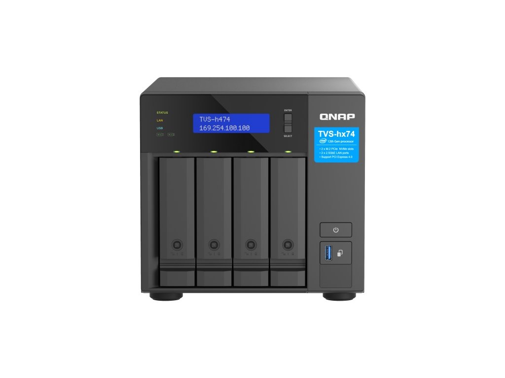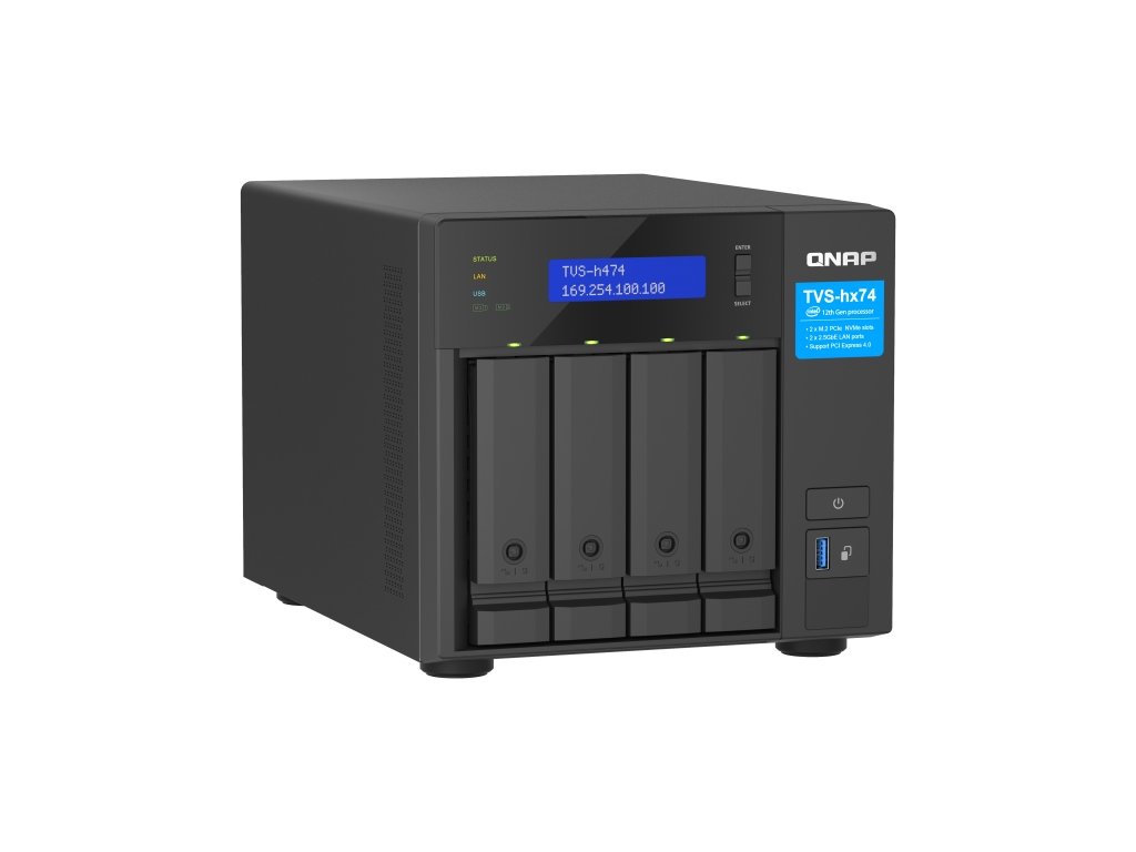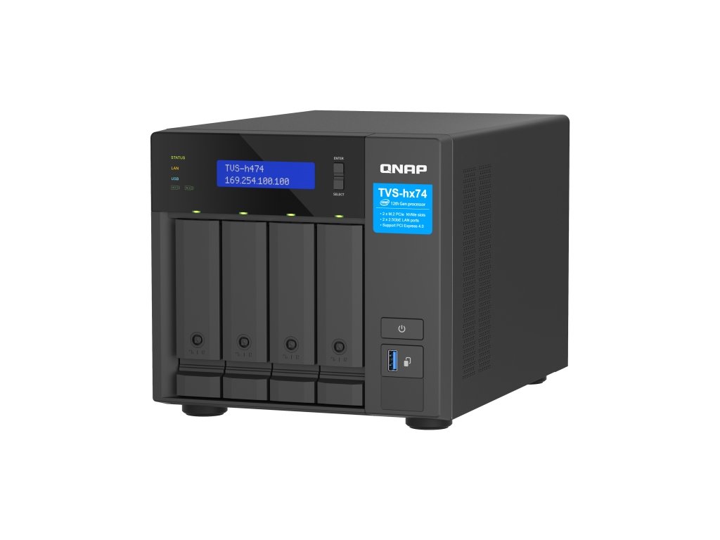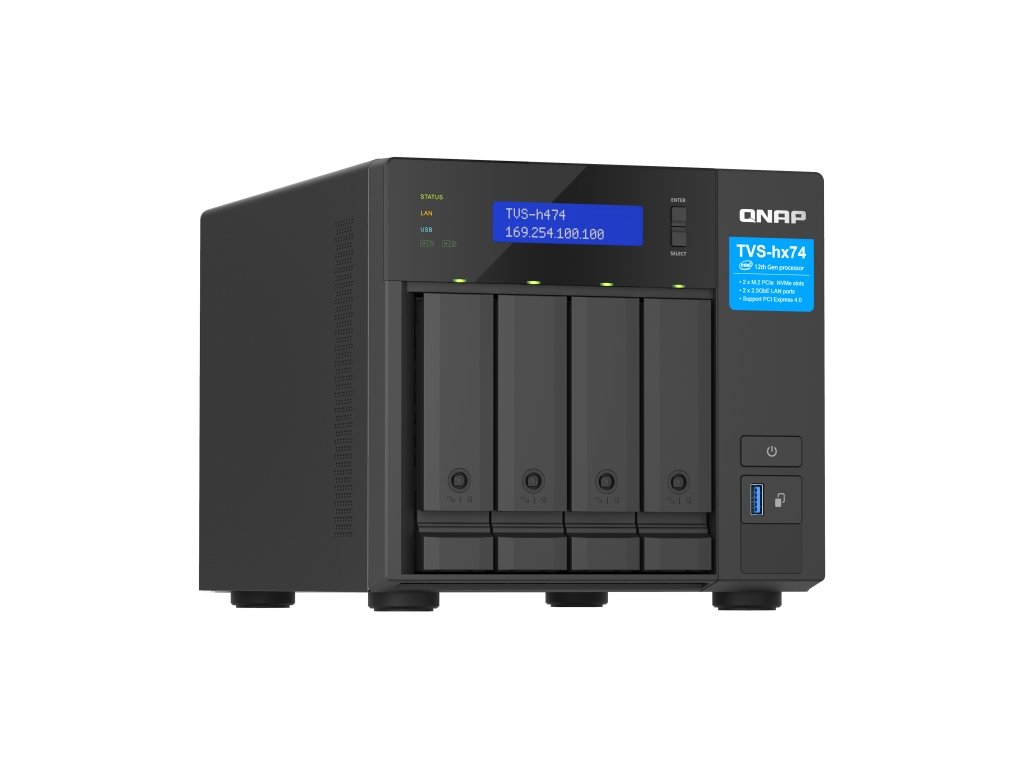 QNAP TVS-h474-PT-8G (2core 3,7GHz, ZFS, 8GB RAM, 4x SATA, 2x M.2 NVMe, 2x PCIe, 2x 2,5GbE, 1x HDMI)