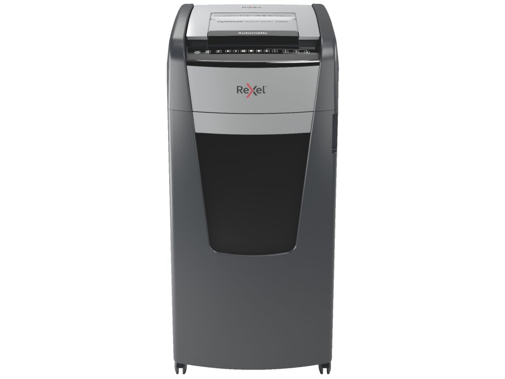 Rexel Optimum AutoFeed+ 750XSkartovačka Optimum AutoFeed 750X automaticky skartuje až 750 listů papíru A4 (80 g /m2) křížovým řezem P-4 (4 x 30 mm). Tento stroj na skartování s automatickým podáváním je sofistikovaný kancelářský skartovač s výsuvným košem o objemu 140L. Není třeba ručně podávat papír nebo nejdříve odstraňovat svorky a kancelářské sponky, tento automatický skartovač papíru udělá vše za vás.