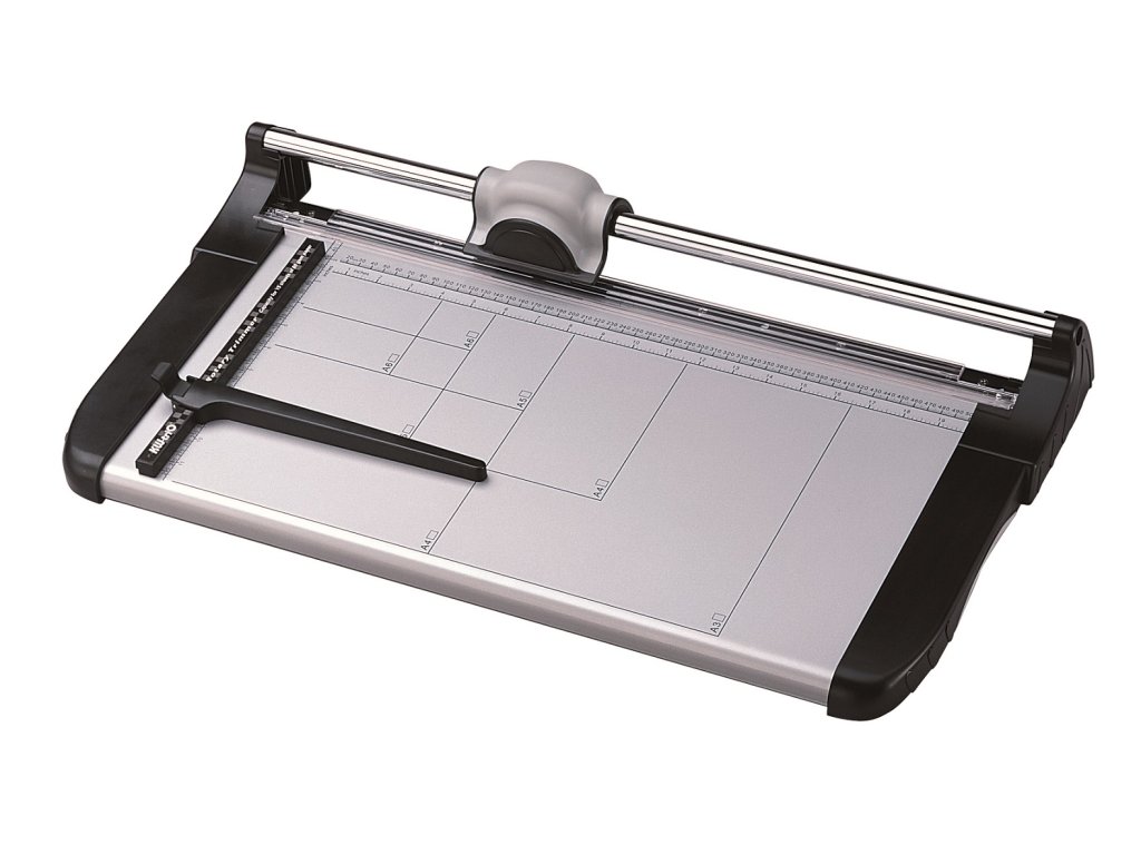Kvalitní kolečková řezačka s pevnou kovovou základnou a řeznou hlavou umístěnou na kovové tyči, určena pro formát A3+. Pracovní stůl je vybaven natištěnými měřítky a posuvnou zarážkou souběžnou s přímkou řezu. Díky rotačnímu noži z tvrzené nerezové oceli jsou řezačky KW Trio vhodné pro řezání i více listů nebo archů.K dispozici je náhradní řezné kolečko nebo celá řezná hlava.