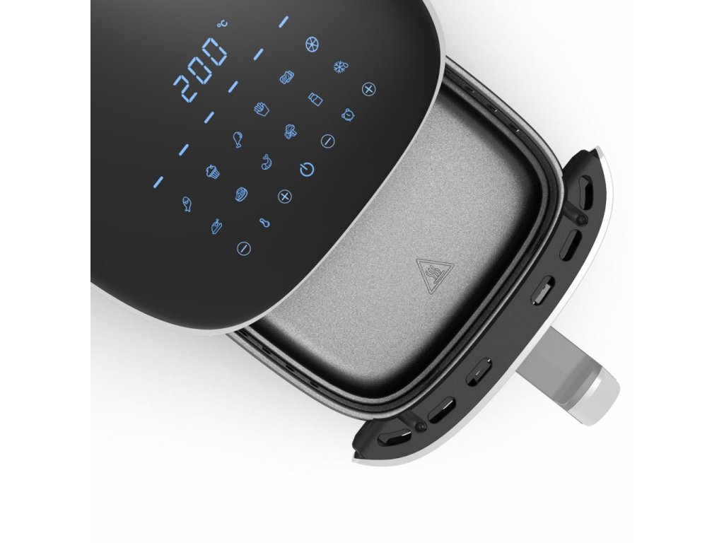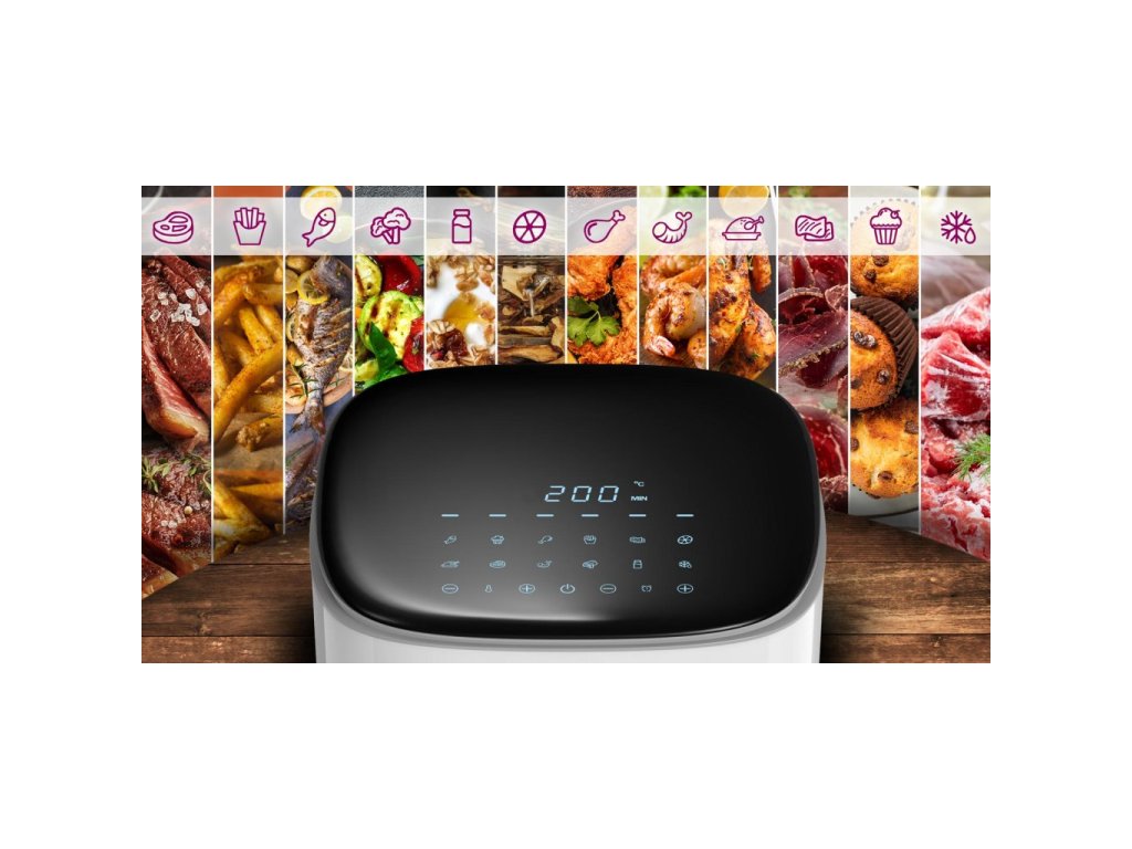 • 12 přednastavených programů: Ryby & Muffiny & Kuřecí stehna & Hranolky & Sušené maso & Sušené houby, ovoce a zelenina & Kuře & Steak & Krevety & Zelenina & Jogurt & Rozmrazování