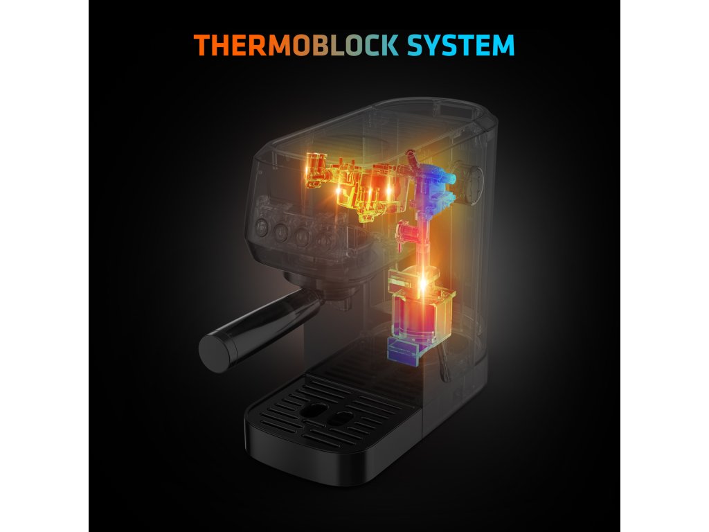 Srdcem tohoto kávovaru je profesionální tlakové čerpadlo s působivým tlakem 20 barů, které zajišťuje dokonalou extrakci kávy s bohatou cremou. Termoblok s bojlerem navíc zahřívá vodu na provozní teplotu velice rychle (již do 120 vteřin), takže na svůj vysněný šálek zbytečně dlouho nečekáte. A praktická je i funkce předspaření, která upěchovanou kávu před samotnou extrakcí krátce provlhčí, takže přes ní protéká voda hezky rovnoměrně – výsledkem toho je vždy vyvážená a plná chuť.