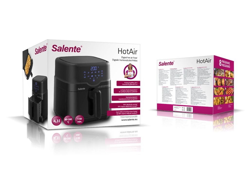 Horkovzdušná fritéza Salente HotAir splňuje současné nejvyšší nároky na zdravou a rychlou přípravu pokrmů a nabízí kombinaci dvou způsobů přípravy - fritování i grilování. I těm nejnáročnějším kuchařům a kuchařkám umožňuje nastavení teploty v rozsahu 80-200 °C v krocích po 1 °C a nastavení času přípravy pokrmu v rozsahu 1-60 minut v krocích po 1 minutě.
