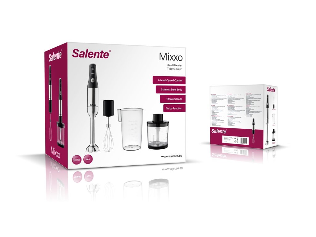 Salente Mixxo přichází do vaší kuchyně i s bohatým příslušenstvím: využívat můžete šlehací nástavec s nerezovou metličkou, mixovací nádobku o objemu 600 ml (s odměrnými ryskami po 100 ml) a taky sekáček s objemem 500 ml, který je vybaven nerezovými noži a silikonovou protiskluzovou podložkou. Pořízením tohoto všestranného mixéru zkrátka získáte kompletní vybavení, které posune vaše gastronomické kouzlení o úroveň výš.