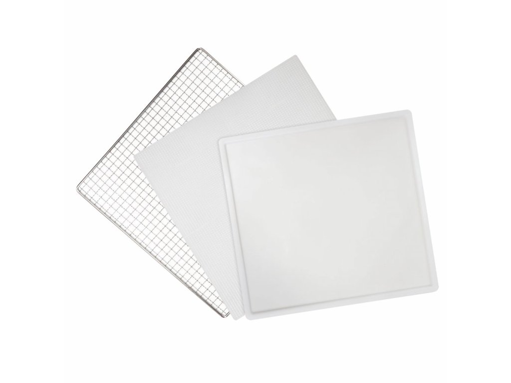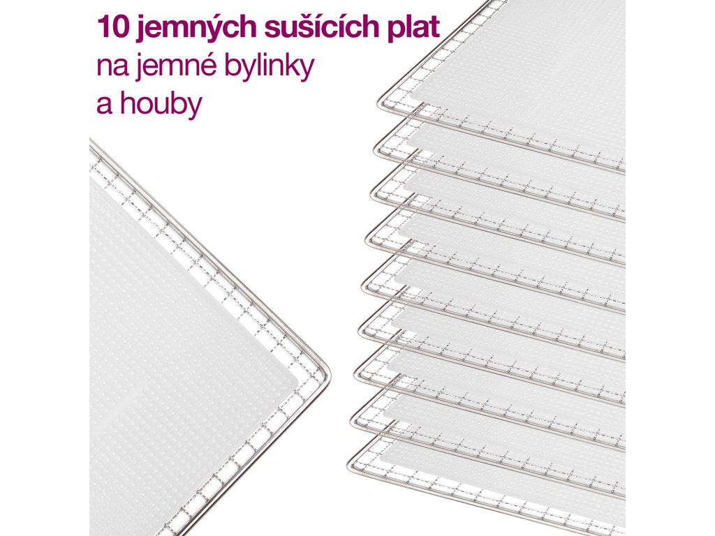 Výbavou navíc je u tohoto modelu sada deseti sušících plat s jemným síťováním pro sušení jemnějších a lepkavých surovin (např. hub, bylinek, banánů, rajčat atp.). Dodáván je i odkapávací tác na dno sušičky, který zachycuje přebytečné šťávy z některých surovin a výrazně tak usnadňuje čištění nerezového interiéru sušičky. Plata i tác mají rozměr 39,4 × 39,4 cm.