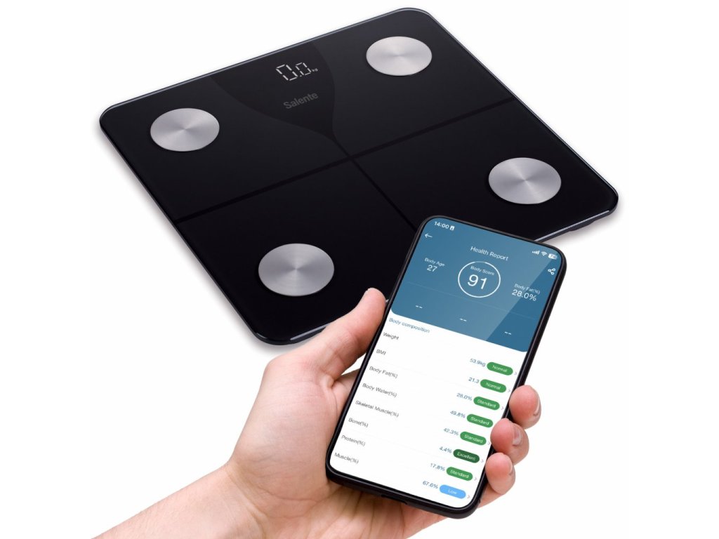 Chytrá osobní diagnostická váha Salente SlimFit s propojením do mobilní aplikace přes Bluetooth umožní sledovat přehledně vývoj tělesné hmotnosti při sportování, dietách i v běžném životě. Váha měří a následně analyzuje 15 parametrů: