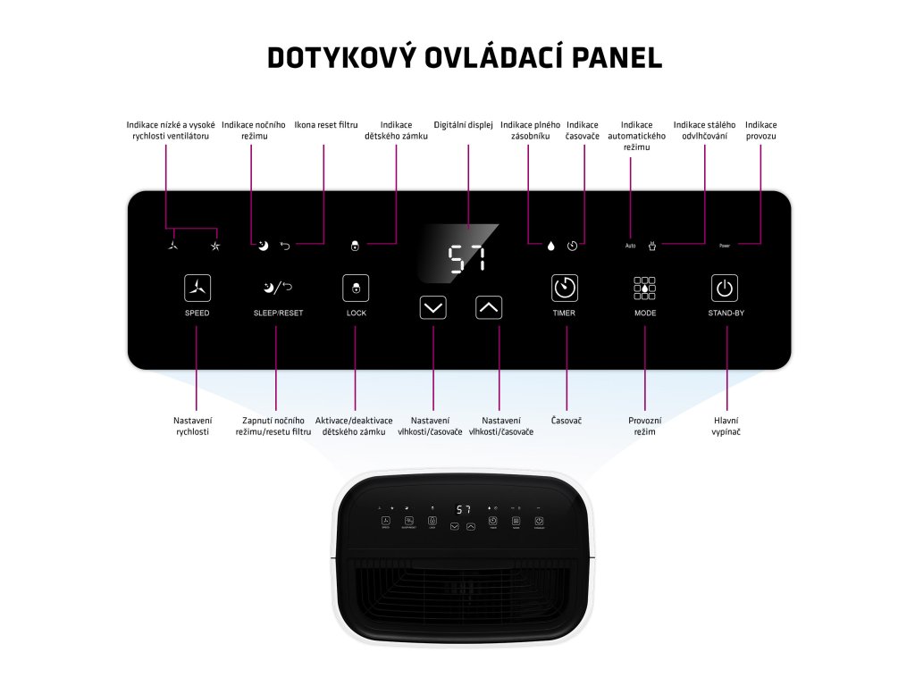 11) dotykový ovládací senzor pro zapnutí/vypnutí odvlhčovače