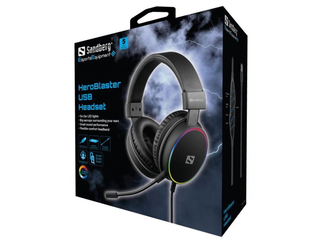 Náhlavní souprava Sandberg HeroBlaster USB Headset nabízí působivý zvuk a obklopí vaše uši, takže budete plně ponořeni do svého herního světa i vesmíru. Přináší fantastický herní zážitek v reálném životě, a zároveň zmírňuje tlak na uši stejně jako vnější sluchátka. Měkká spona přes hlavu se automaticky přizpůsobí tvaru hlavy tak, že nošení náhlavní soupravy je pohodlné celé hodiny.On-Ear LED světla