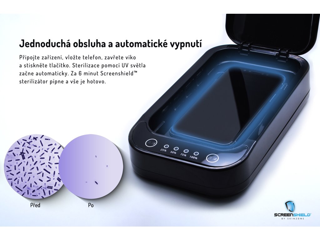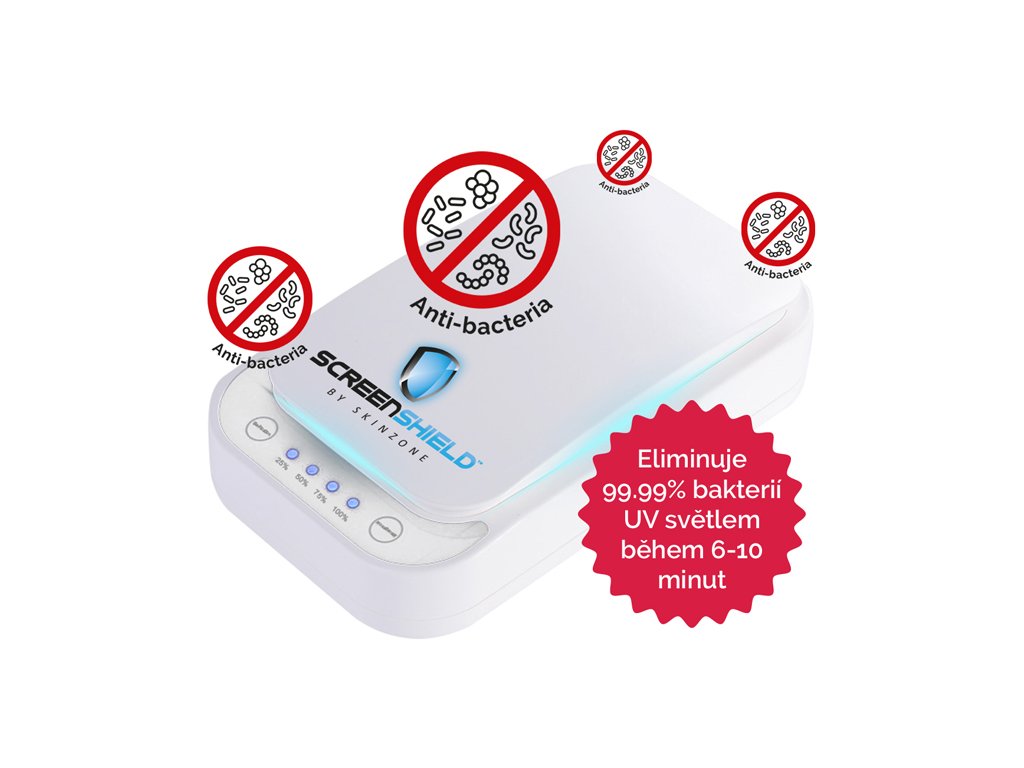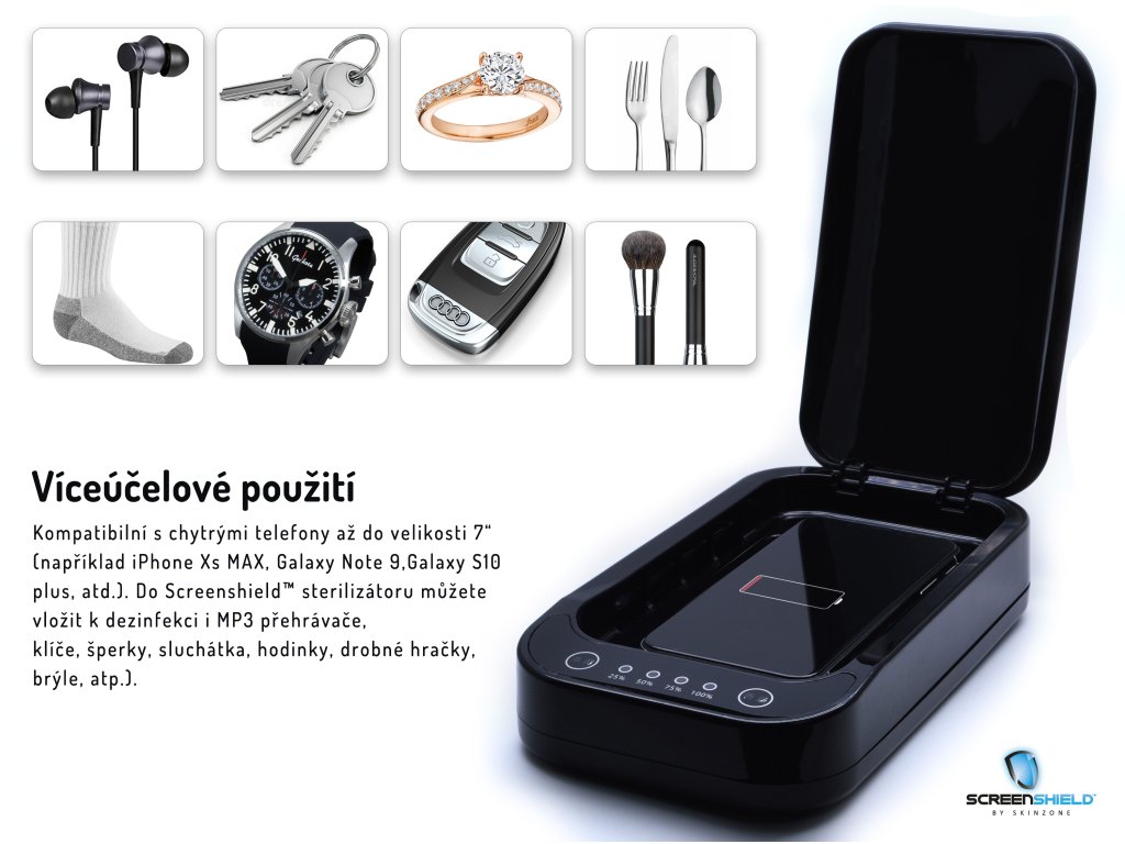 Screenshield™ přenosný UV sterilizátor eliminuje 99,99 % bakterií na mobilních telefonech, klíčích, špercích, bižuterii a jiných zařízeních do velikosti 180 × 100 × 22 mm. Podle průzkumů se na mobilním telefonu usazuje až 1 milion bakterií (cca 20 000 na 1 cm2). Toto šikovné zařízení pracující na bázi UV světla bakterie zničí během 6-10 minut a to zcela jednoduchým a téměř bezobslužným způsobem.Dodatočné parametre