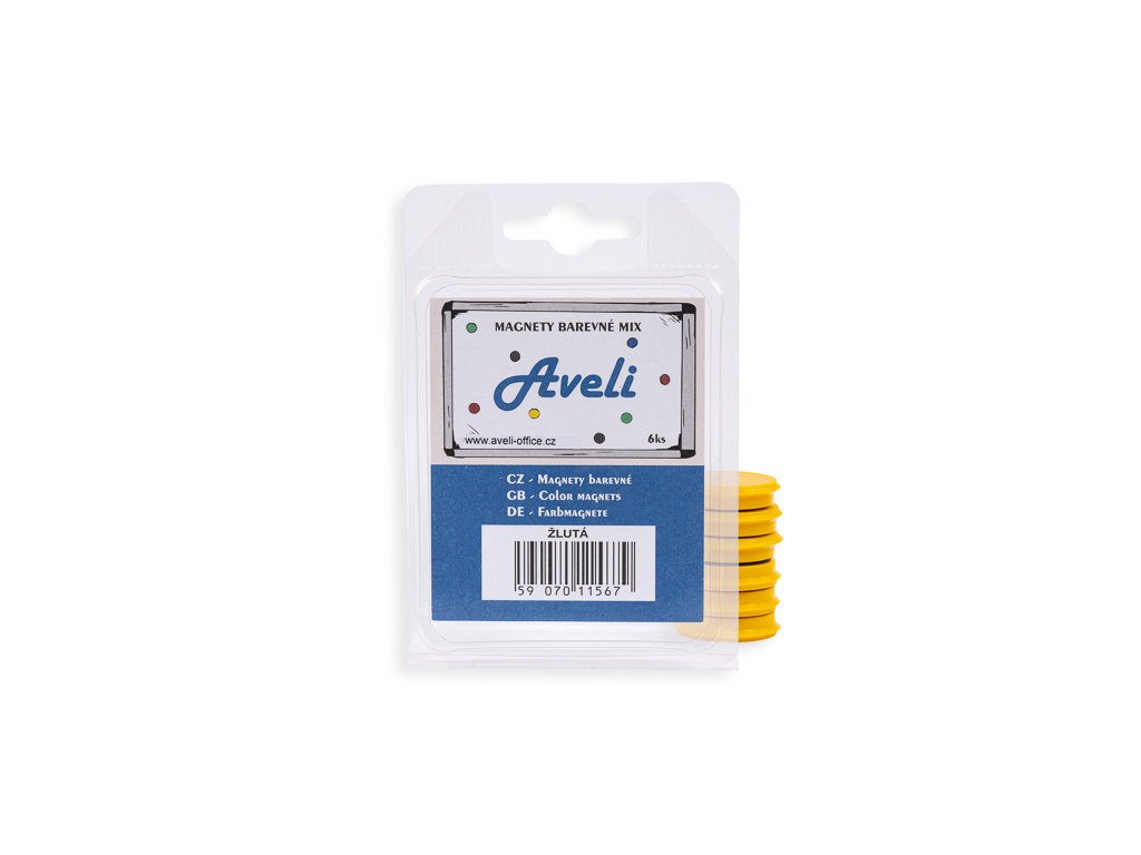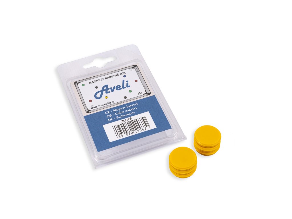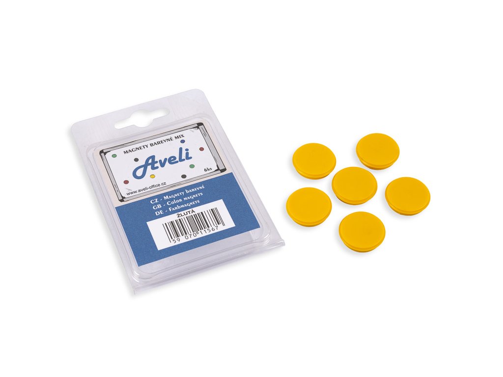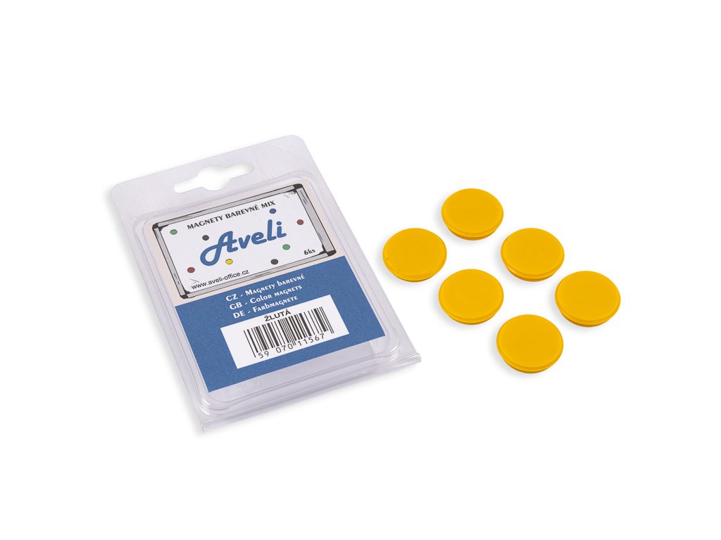 Magnety pro tabule Aveli v barevných rozlišeních.Balení 6 kusů magnetů v žluté barvě