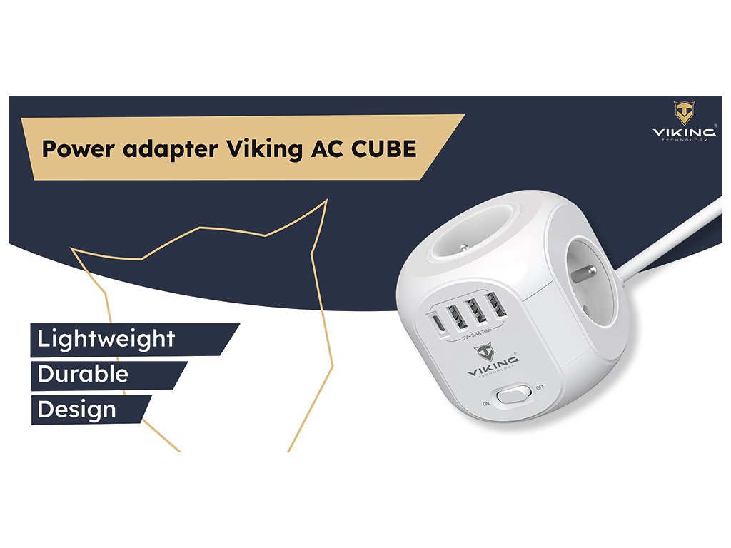 Síťový adaptér • rozbočovač • zásuvka • 4 x AC (230V) výstup • 3 x USB-A (5V/2.4A) • 1 x USB-C (5V/3A) • krychlový design • kompaktní rozměry • možnost nabíjení až 8 zařízení současněSíťový adaptér Viking AC Cube