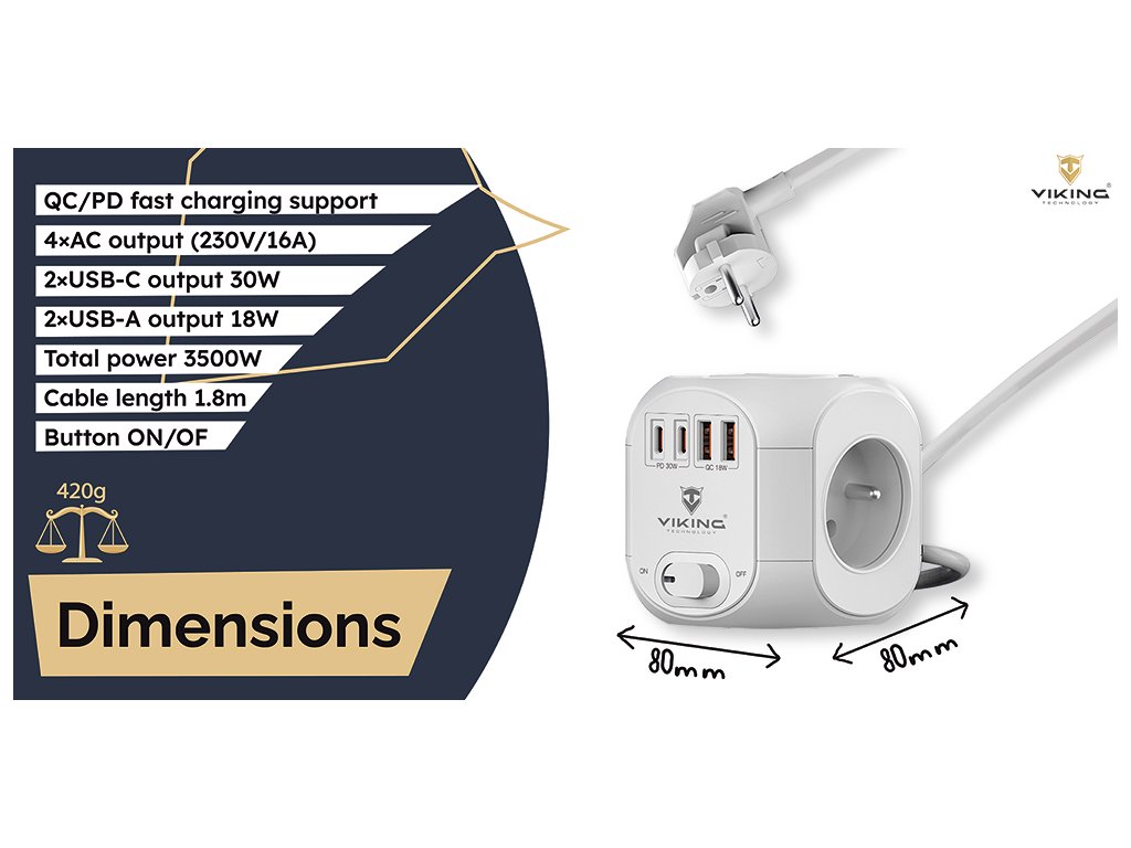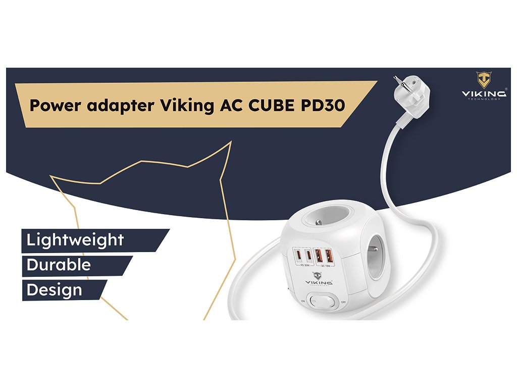 Viking AC CUBE PD30 kombinuje čtyři USB porty (2× USB-C, 2× USB-A), čtyři síťové zásuvky a 1,8m prodlužovací kabel v jednom elegantním a prostorově úsporném zařízení. Umožňuje současně napájet až osm spotřebičů nebo elektroniky, aniž by zbytečně zabíral místo na pracovním stole.