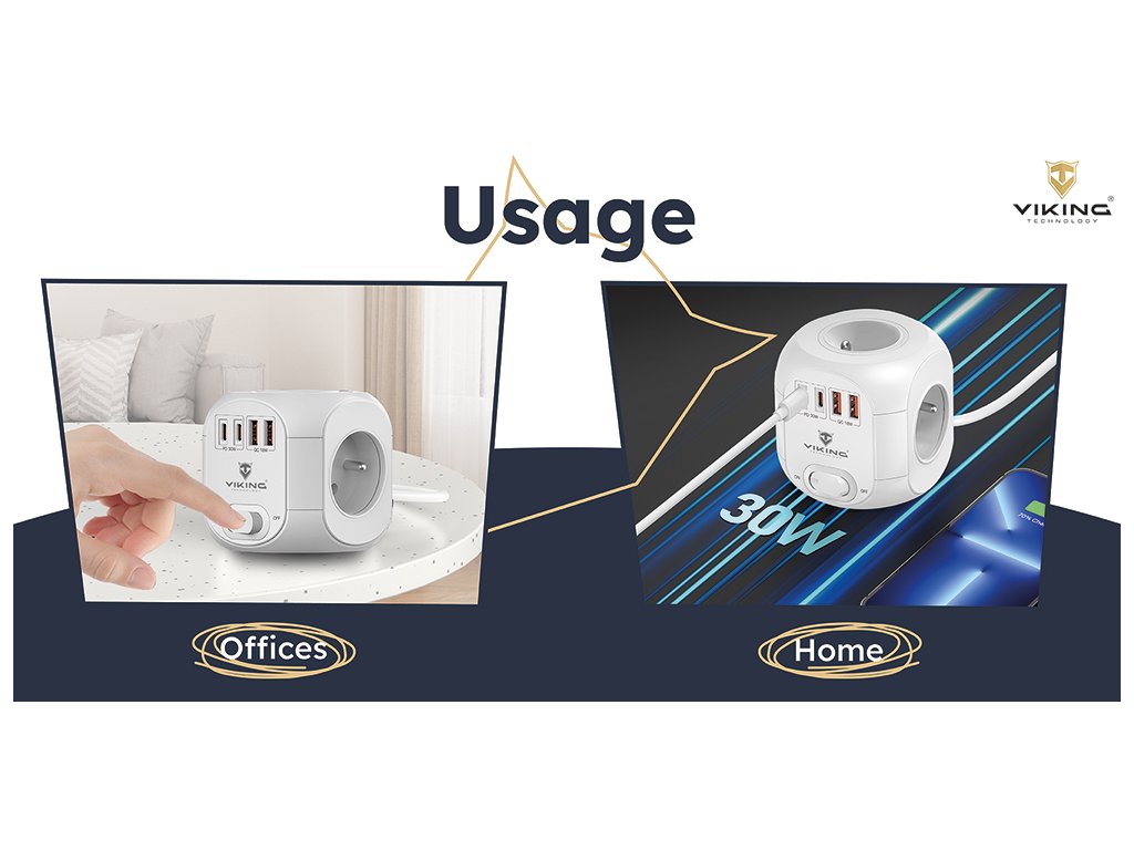 Viking AC CUBE PD30 je praktickým řešením pro každé prostředí – ať už v kanceláři, kde pomůže udržet pořádek na pracovním stole, v obývacím pokoji pro organizované a pohodlné napájení, v dětském pokoji pro bezpečné nabíjení elektroniky, nebo v kuchyni pro snadné připojení vašich spotřebičů.