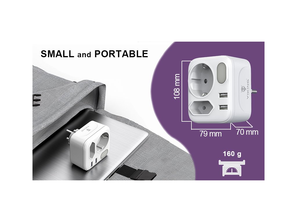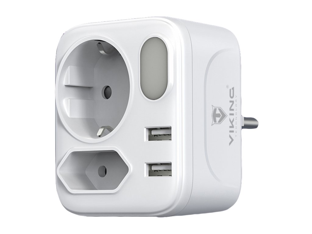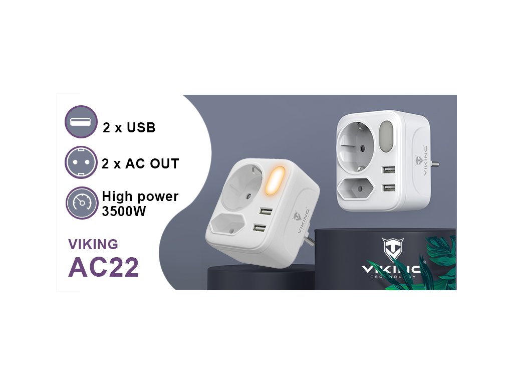 Síťový adaptér • rozbočovač • zásuvka • 2 x AC (230V) výstup • 2 x USB-A (5V/2.4A) • kompaktní design a rozměry • možnost nabíjení až 4 zařízení současně • LED svítilnaSíťový adaptér Viking AC22