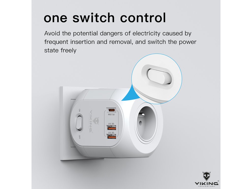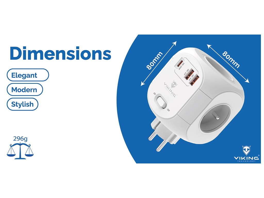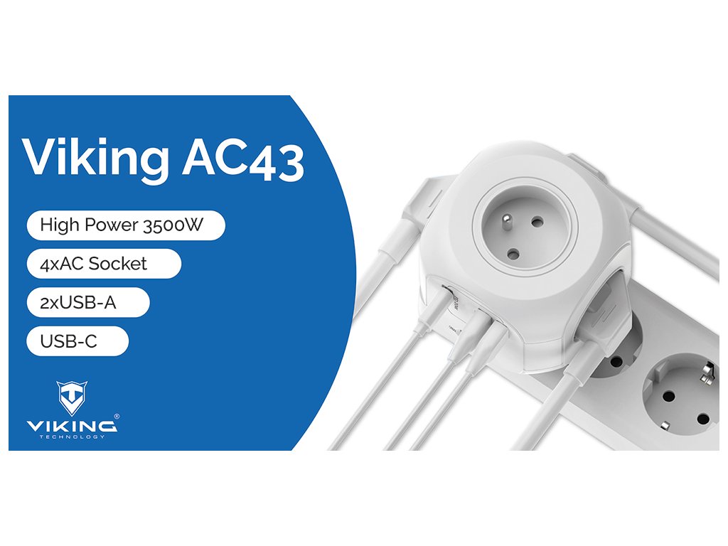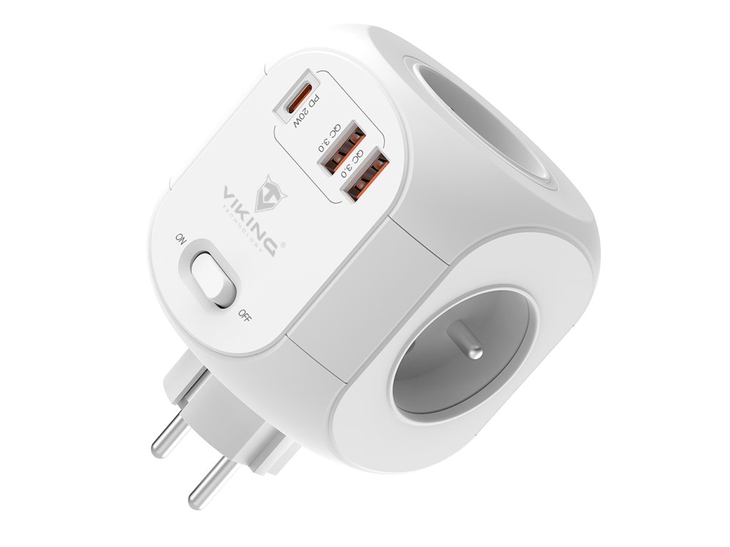 Síťový adaptér • rozbočovač • zásuvka • 4 x AC (230V, 16A) výstup • 2 x USB-A (5V/3A, 9V/2A, 12V/1,5A) • 1 x USB-C (5V/3A, 9V/2,22A, 12V/1,67A) • kompaktní rozměry • vypínač ON/OFF • možnost nabíjení až 7 zařízení současněSíťový adaptér Viking AC43