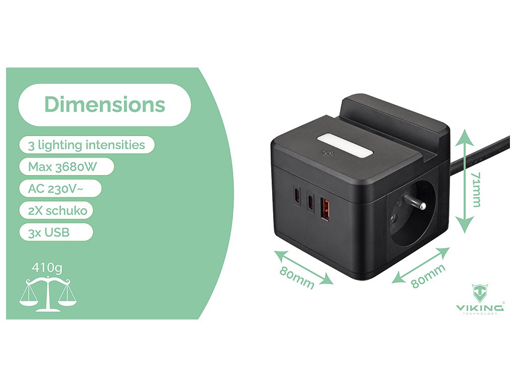 Síťový adaptér VIKING YC23H kombinuje 2 AC výstupy, 3 USB porty, což umožňuje nabíjení až 5 zařízení současně. Je vybaven držákem na mobilní telefon a dotykovým světlem se třemi úrovněmi svícení, zajišťujícím pohodlné a efektivní používání doma i v kanceláři.