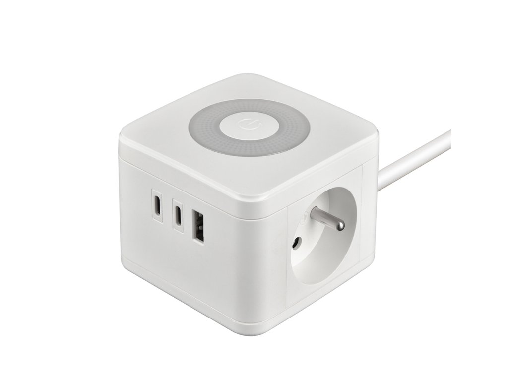 Síťový adaptér VIKING YC23L, bílá/Output:2xAC,1xUSB-A,2xUSB-C/dotykové světlo/1,4m kabel