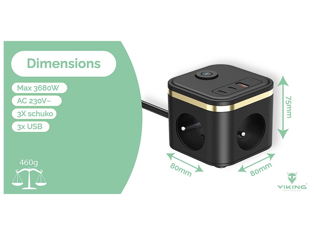 Síťový adaptér • rozbočovač • zásuvka • 3 x AC (230V) výstup • 1 x USB-A (5V/3A) • 2 x USB-C (5V/3A) • praktické tlačítko ON/OFF • kompaktní rozměry a design • kabel 1,4 m • možnost nabíjení až 6 zařízení současněSíťový adaptér VIKING YC33