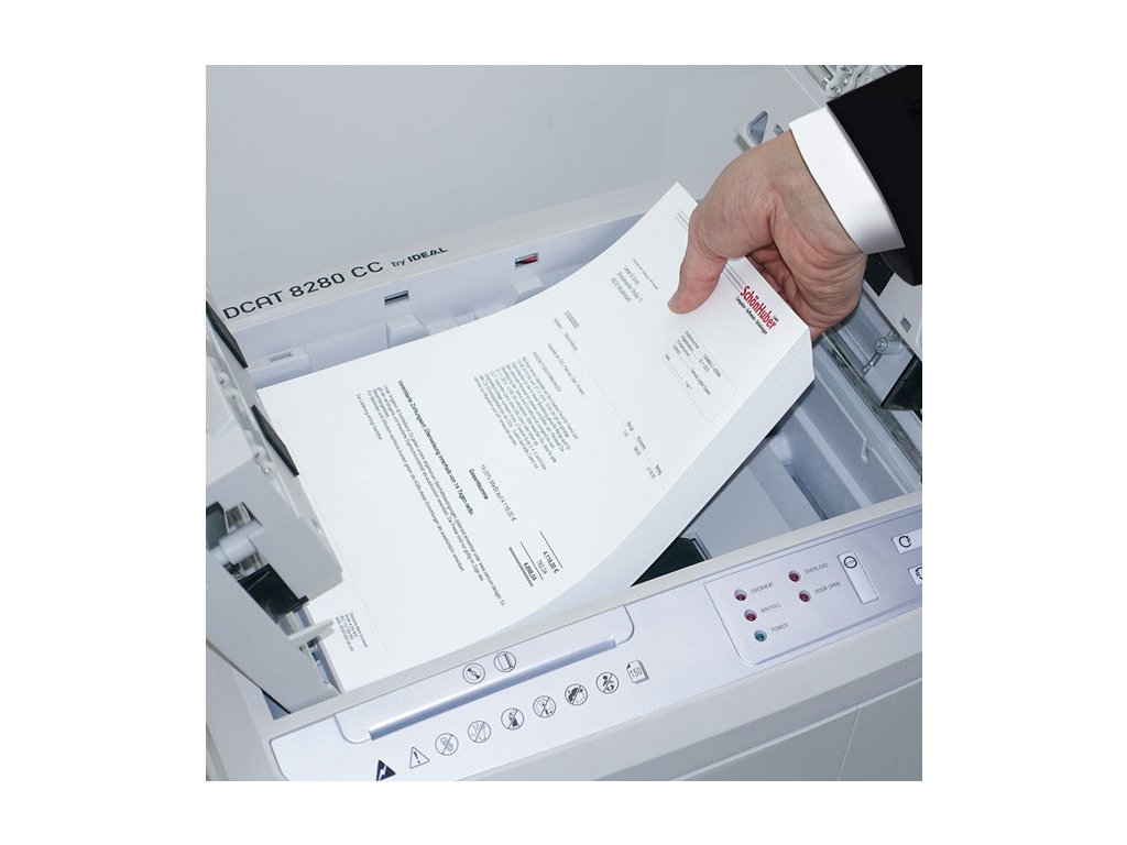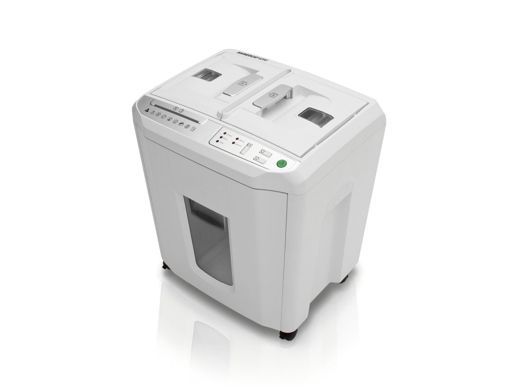 Skartovací stroj s automatickým podavačem. Zařízení je schopno na jeden pracovní cyklus při automatickém podávání skartovat až 150 listů 80g papíru na částice 4×10 mm. Objem koše 30 litrů. Oddělený vstup pro skartaci CD/DVD nebo plastových karet se samostatným odpadním košem usnadňuje následné oddělení skartovaného odpadu. Vstup pro ruční vložení a následnou skartaci až 5 listů 80 g papíru najednou.• Automatické přepnutí do režimu EcoMode (ekonomický mód s nulovým odběrem energie) v případě nečinnosti