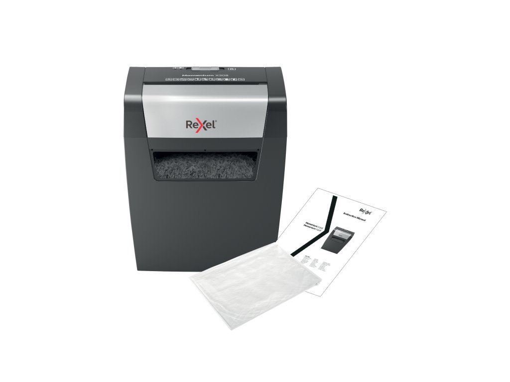 Nezastavitelná skartovačka! Rexel Momentum X308 skartuje až 8 listů najednou a vydrží v nepřetržitém chodu 3 minuty, vhodná pro použití doma. Křížový řez na úrovni zabezpečení P3 řeže papír na části o velikosti 5x42 mm. Odpadní koš s kapacitou 15 l pojme 100 listů A4.Skartovací cyklus 3 minuty