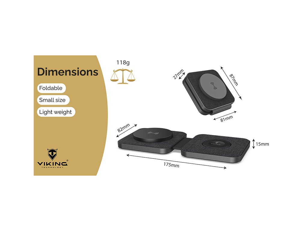 Skládací wireless nabíječka Viking WN21 se díky svému skládacímu mechanismu vyznačuje mimořádnou kompaktností a snadnou přenositelností. Ve složeném stavu má rozměry pouhých 27 mm na výšku, 87 mm na délku a 81 mm na šířku, a při rozložení je dlouhá 175 mm.