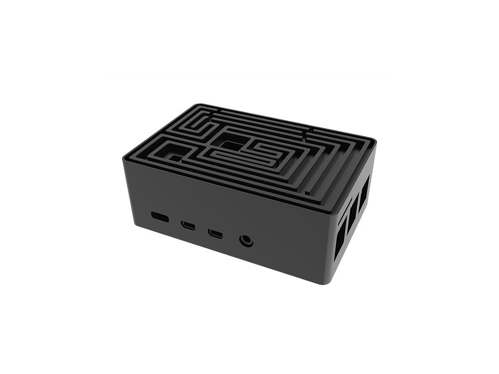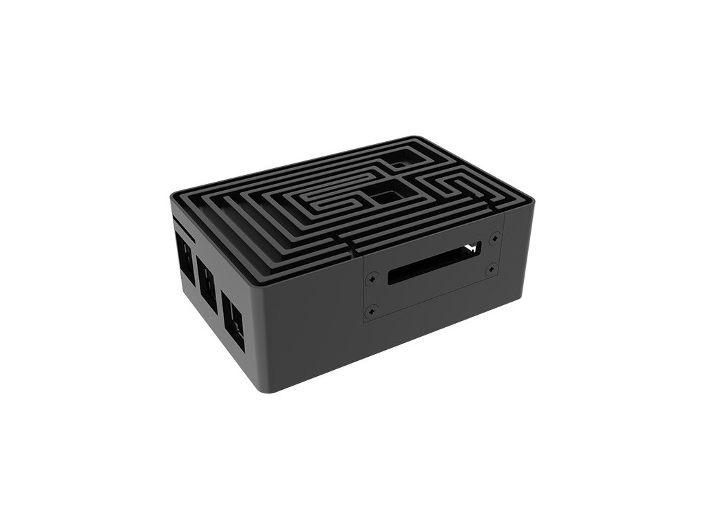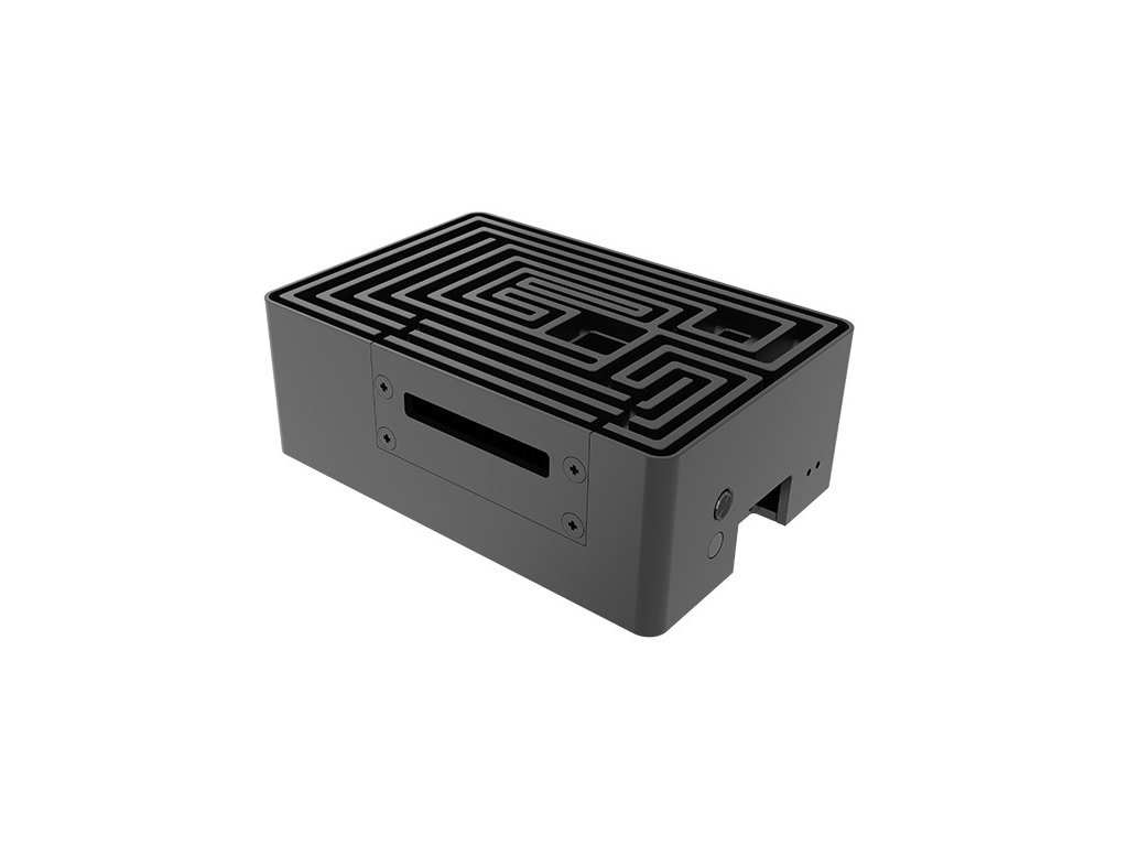 Černá eloxovaná skříň s nápadným designem bludiště nahoře. Vestavěné duální hliníkové jádro tiše chladí Raspberry Pi 4. Je vybavena přeprogramovatelným tlačítkem napájení a plnou podporou I/O.Materiál: Černý anodizovaný hliník