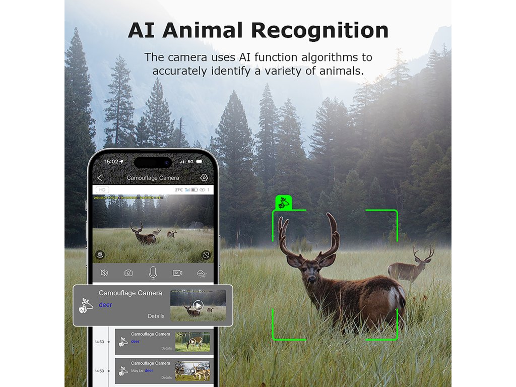 Kamera je vybavena PIR senzorem, který spolehlivě detekuje pohyb až na vzdálenost 12 metrů. Navíc disponuje funkcí detekce teploty a rozpoznávání zvířat s AI.