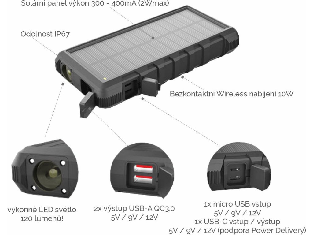Kapacita 24000mAh • rychlonabíjení QC3.0 a Power Delivery • wireless bezdrátové nabíjení 10W • výkonný solární panel 300mA max.• podpora vlastního rychlonabíjení až 18W.Solární outdoorová powerbanka VIKING W24W 24000mAh