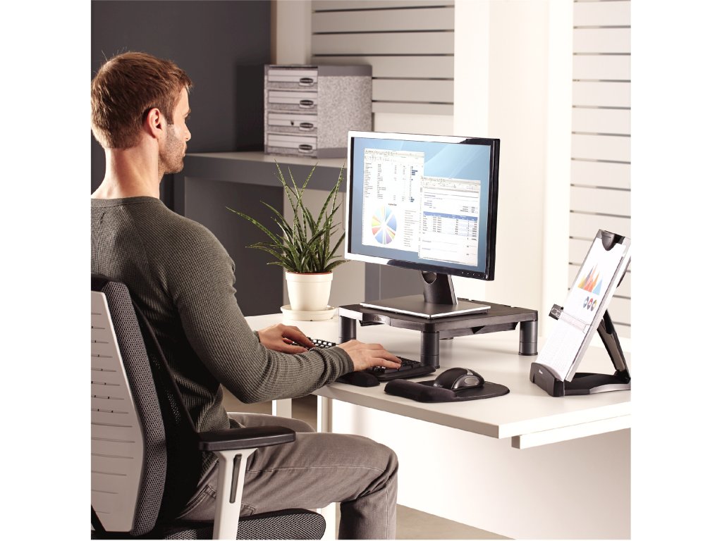 Používáním stojanu pod monitor Fellowes STANDARD předcházíte bolesti šíje a krční páteře. Umožňuje nastavení monitoru na úroveň očí, čím zmírňuje svalové napětí ramen a krku. Vhodné do kanceláře i domácnosti. Určen pro monitory či LCD / TFT monitory do velikosti 17" a maximální hmotnosti do 27 kg. Z vysoce odolného materiálu.• usnadňuje organizaci pracovního prostoru
