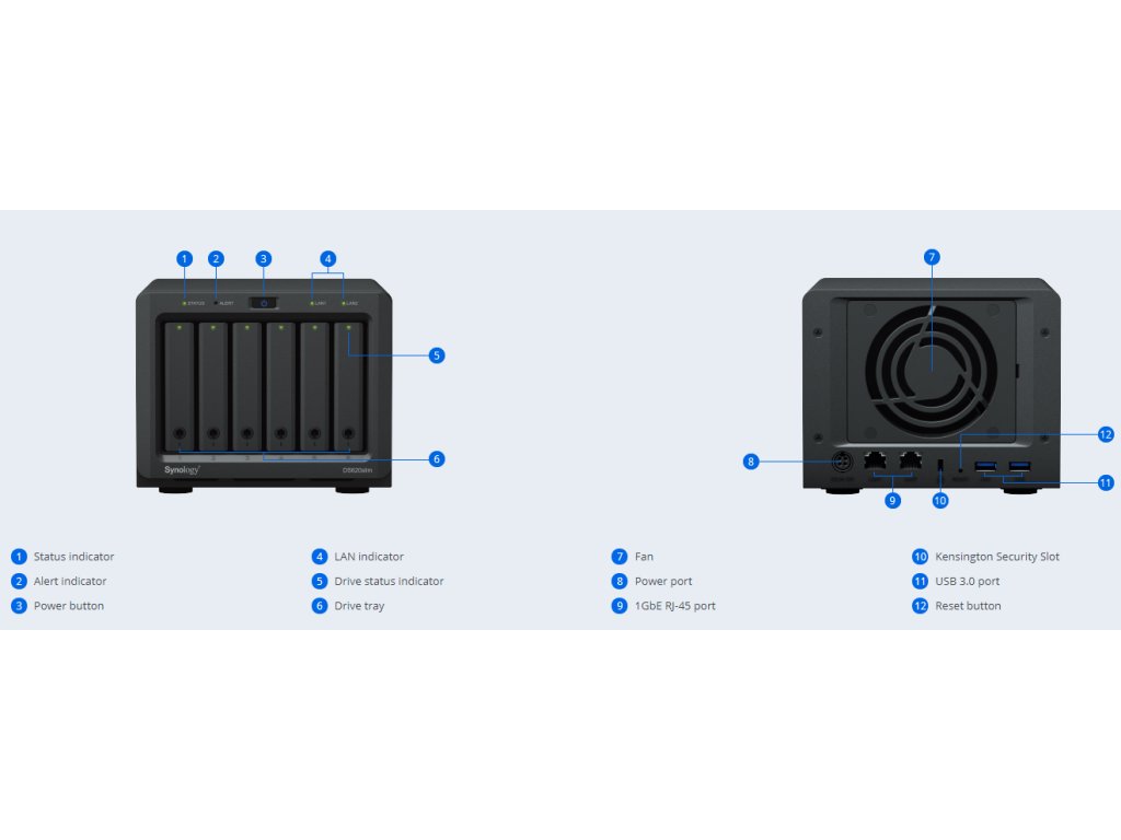 DS620slim je mini 6ti místné NAS se stylovým designem šasi, který dokonale ladí s moderními pracovišti nebo byty. DS620slim, podporující technologii okamžitého snímkování a transkódování videa, je všestranným řešením správy souborů, které splňuje potřeby profesionálů v oblasti pokročilé ochrany dat a vysoce kvalitního streamování médií.Vlastnosti