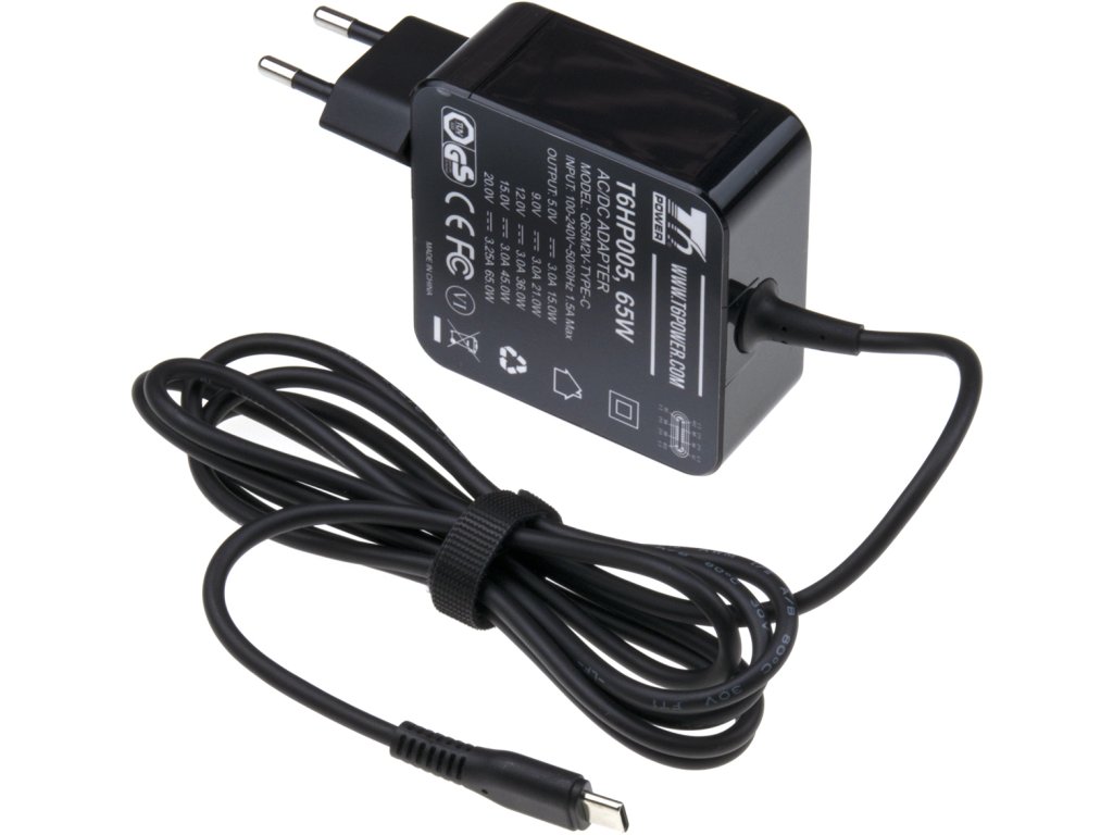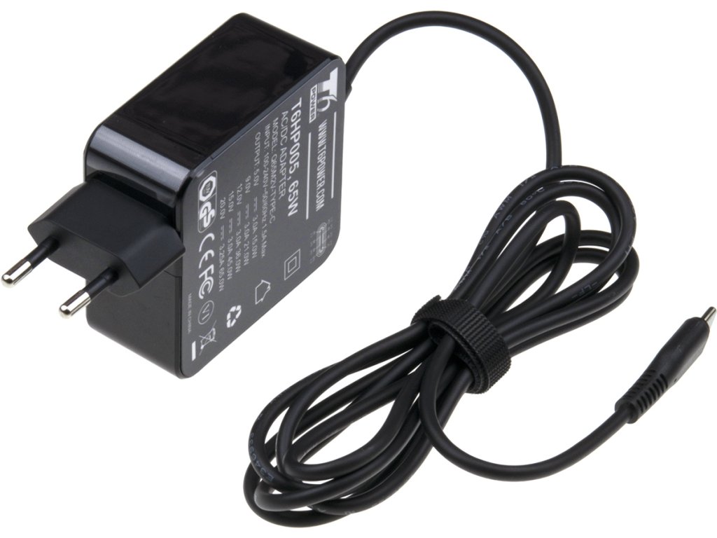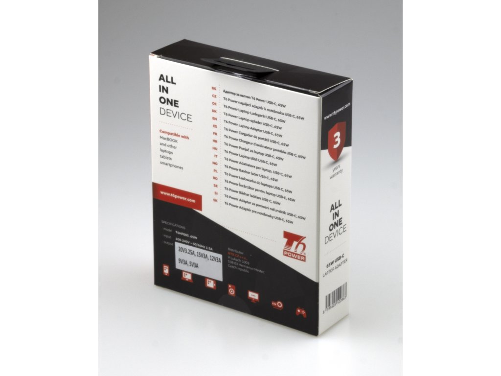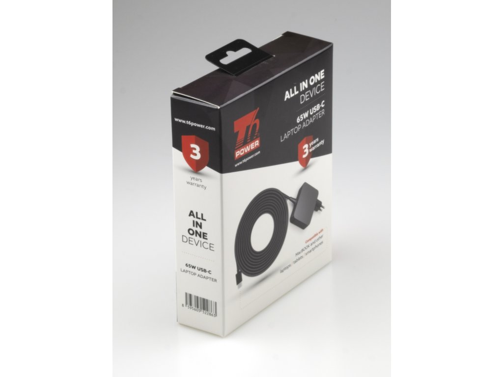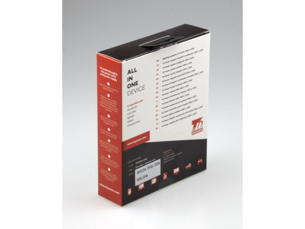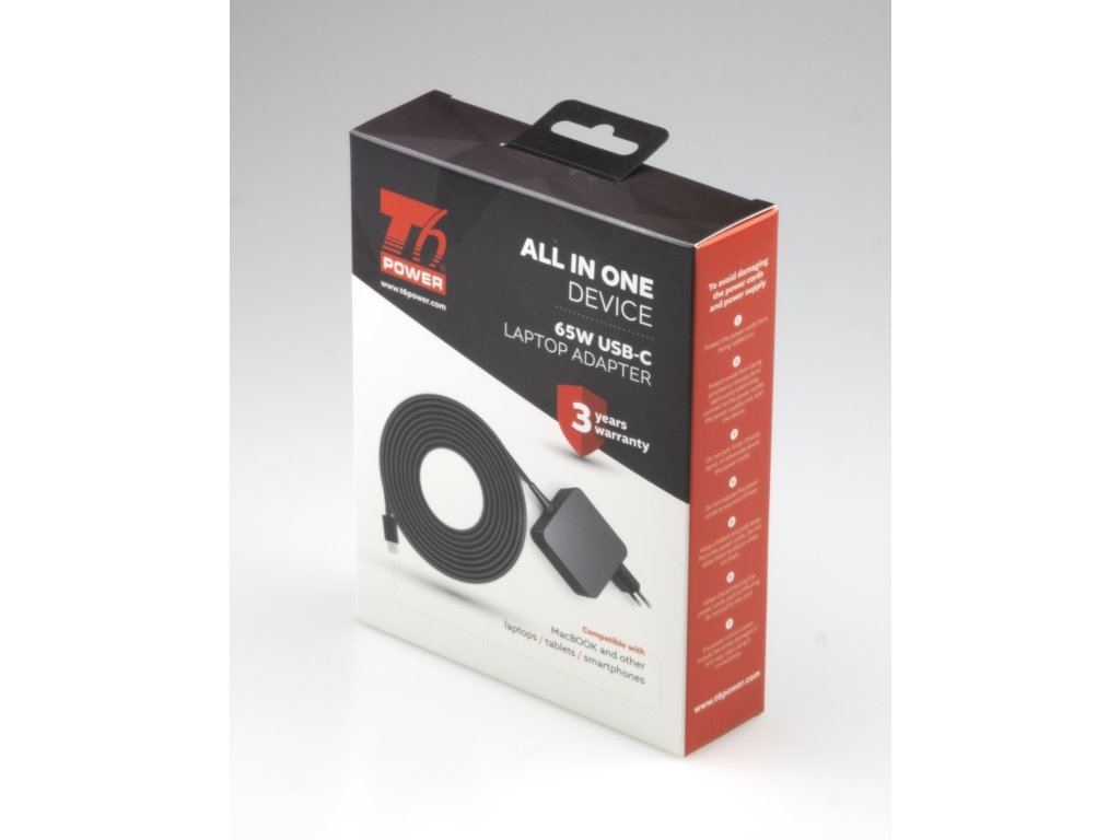 Univerzální adaptér značky T6 Power s výkonem 65 W je ideálním zdrojem energie pro notebooky, ultrabooky, MacBooky, tablety, mobílní telefony, monitory, atd.