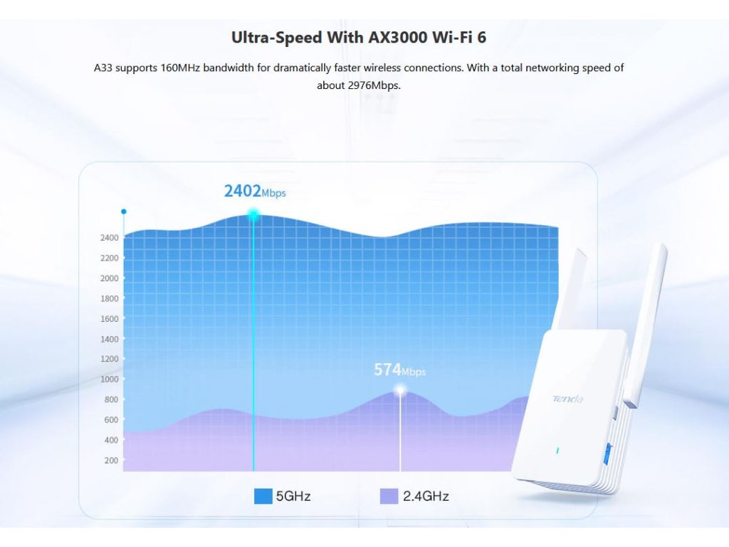 Tenda A33 - WiFi Range Extender AX3000 WiFi 6, opakovač 2976 Mb/s, 1x GLAN 1 Gb/s, WPS,2x 5dBi, WPA3