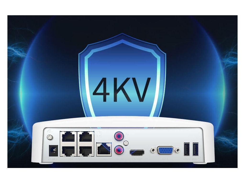 Rekordér podporuje PoE napájení všech 4 portů RJ45 pro kamery, a to dle standartů PoE IEEE 802.3at/802.3af. Celkem 40 W. Připojení kamer je možné až na 250m dlouhém Ethernet kabelu. Kameru stačí pouze připojit k portu rekordéru.