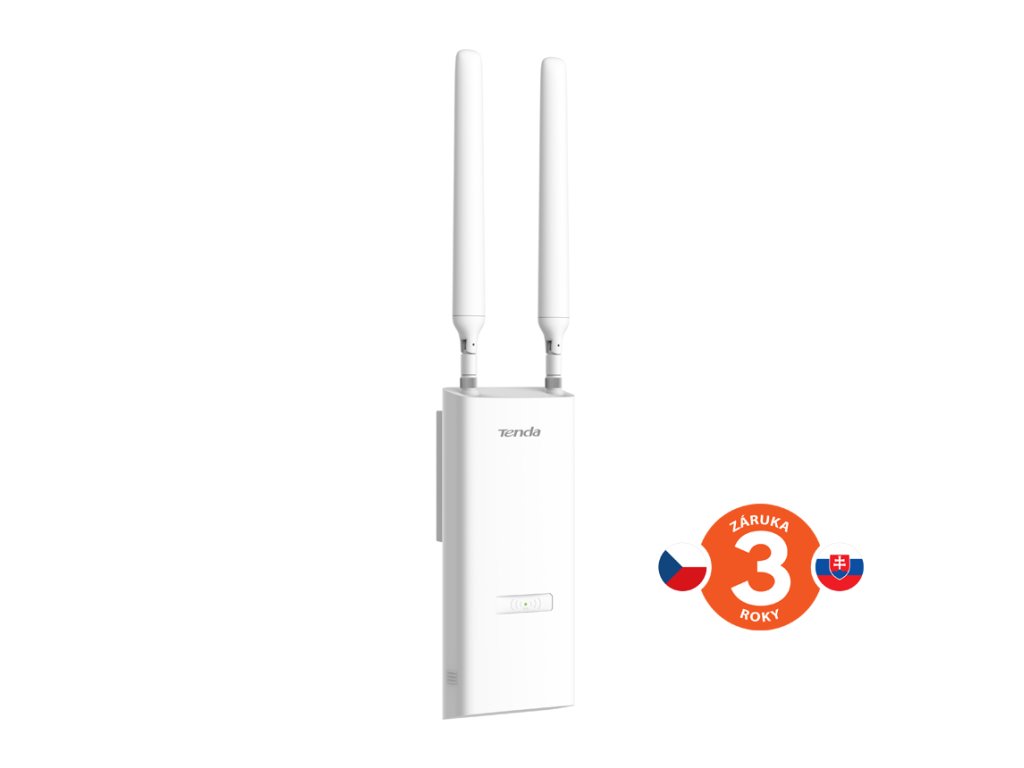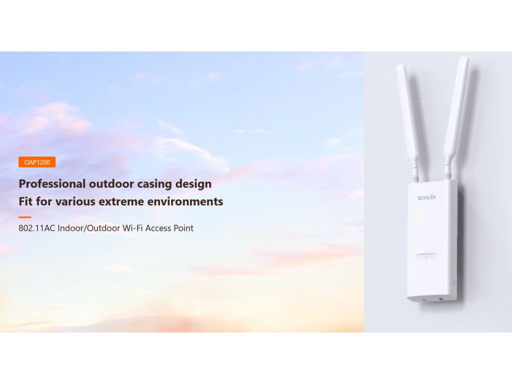 Tenda OAP1200 je bezdrátový Wi-Fi přístupový bod (Access Point) pro venkovní i vnitřní použití, podporuje standardy 802.11ac(wave2)/a/b/g/n v pásmu 2,4 a 5 GHz s rychlostí až 1167 Mb/s s technologií MU-MIMO, OFDMA, Beamforming. Podporuje rychlý přechod klientů Fast roaming 802.11 k/v/r. Obsahuje 1x Gigabitový LAN port, který podporuje aktivní PoE 802.3af napájení ale také pasivní napájení (24V 0,5A). Podpora 12x SSID (8x 2,4 GHz + 4x 5GHz), VLAND tagging, AP Isolation a další technologie, připojení až 256 klientů. Obsahuje držák pro umístění na stěnu, strop, sloup apod.