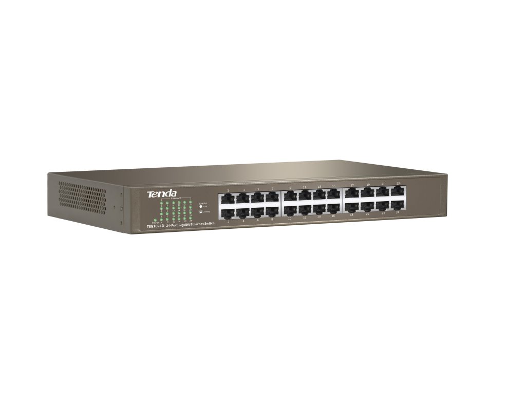 Tenda TEG1024D přepíná data pomocí 24 portů RJ45 s přenosovou rychlostí 10/100/1000 Mb/s s automatickou detekcí rychlosti. Switch disponuje ochranou proti přepětí 6000 V. Podpora přepojování uzlů v módu Store-and-Forward. Full-duplex kontrola toku 802.3x, half-duplex kontrola toku v režimu Back-Pressure. Maximální propustnost 48 Gb/s. Balení obsahuje kovové "L" držáky pro montáž do rozvaděče. Switch je napájen interním zdrojem
