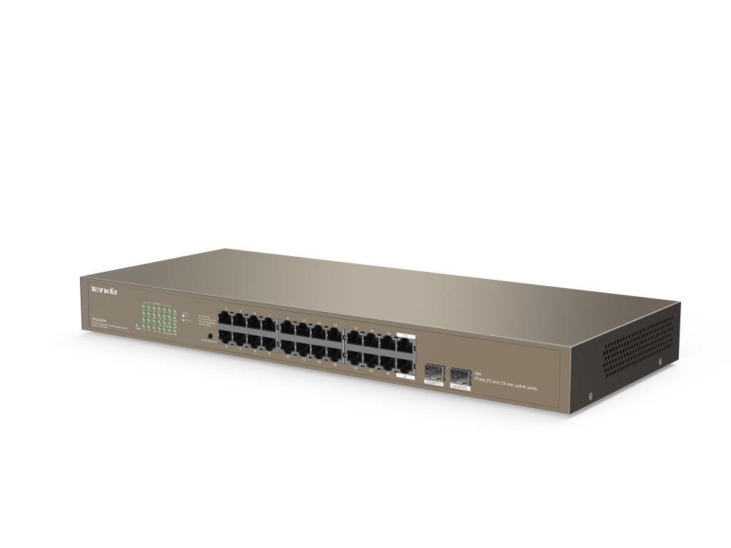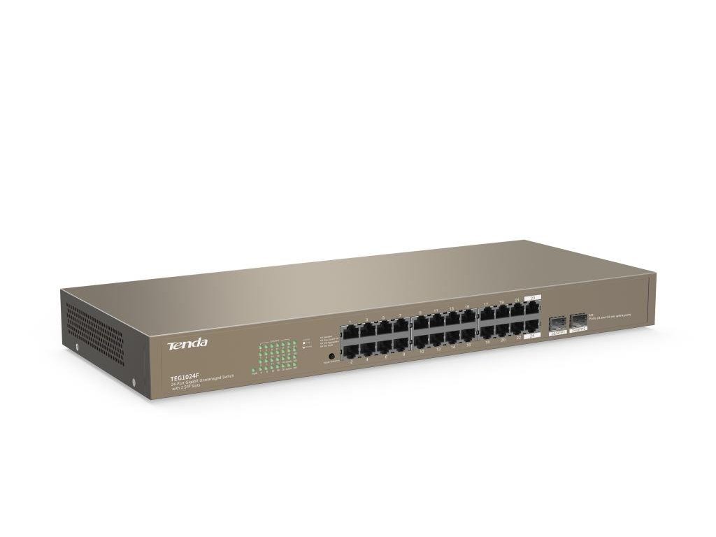 Tenda TEG1024F přepíná data pomocí 24 portů RJ45 a 2 portů SFP pro připojení optiky, 22 portů 10/100/1000 Mb/s RJ45 + 2x Combo SFP/RJ45 (SFP rychlost 1000Mb/s a RJ45 rychlost 10/100/1000 Mb/s). Switch má ochranu proti přepětí 6kV. Podpora přepojování uzlů v módu Store-and-Forward. Full-duplex kontrola toku 802.3x, navíc podporuje energeticky úspornou normu 802.3z.