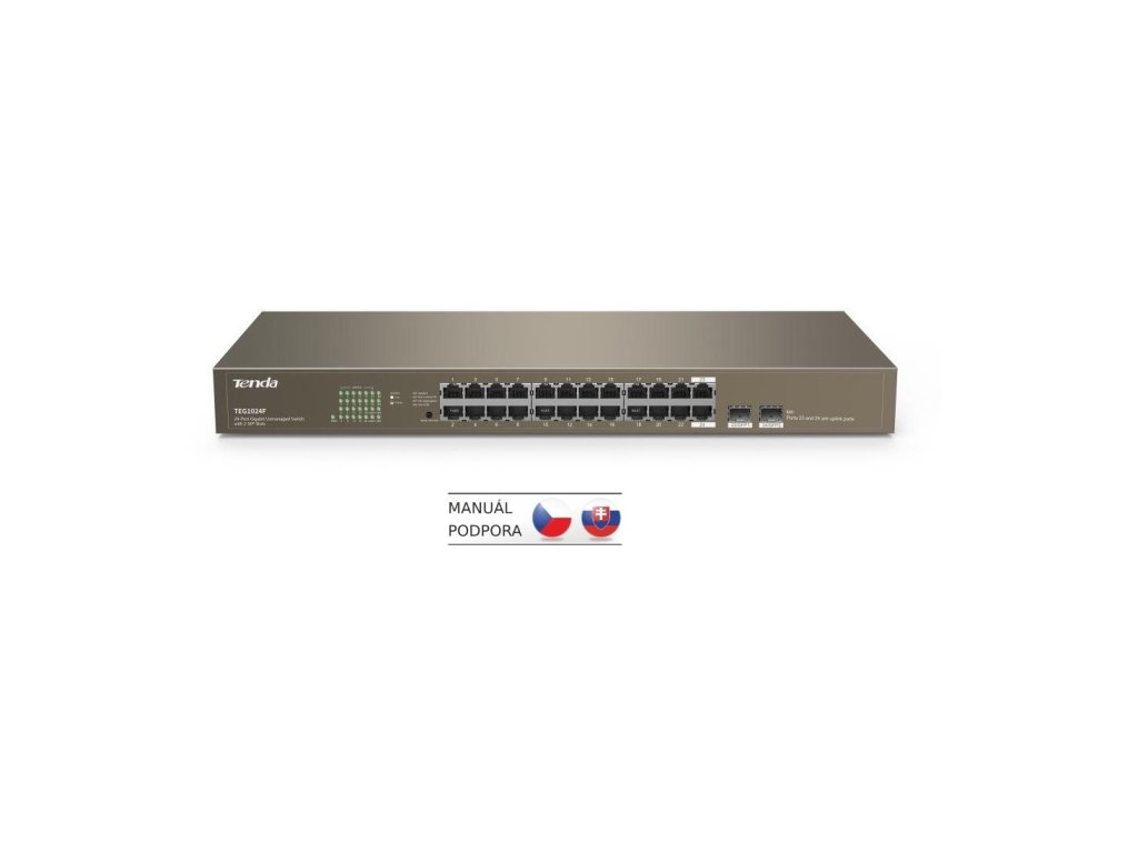 Tenda TEG1024F je 24ti portový Gigabitový Ethernet switch s 2x SFP sloty. 22 portů 10/100/1000 Mb/s + 2x Combo SFP/RJ45 1000 Mb/s. Fanless, bez ventilátorů. Rackmount, velikost switche 19". Ochrana proti přepětí 6 kV. Přepínání VLAN, Aggregation, Flow Control, Standart. Kovový obal.Součástí balení je český, slovenský a polský manuál.