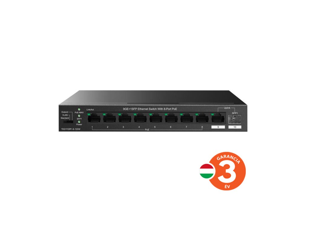 Tenda TEG1110PF-8-120W PoE+ AT switch 8xPoE 802.3af/at + Uplink RJ45 + SFP port, 110W, PoE+, fanless