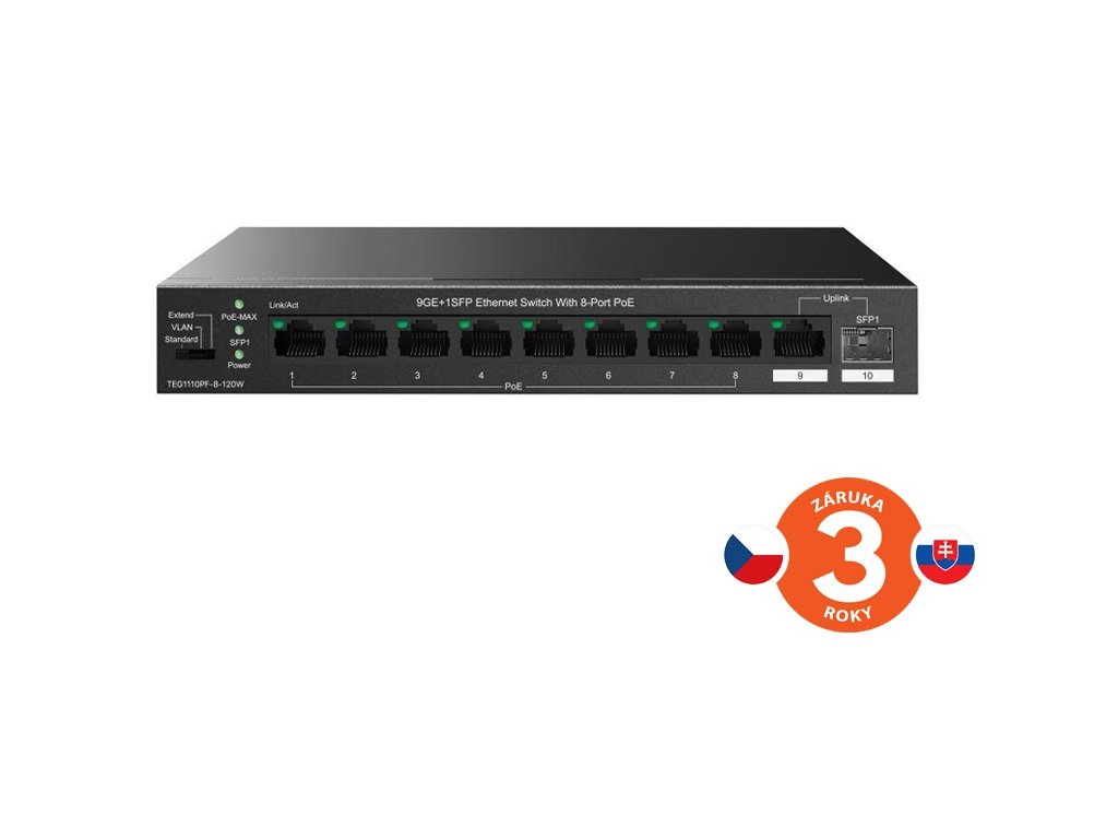 Tenda TEG1110PF-8-120W přepíná data pomocí 9 portů RJ45 a optického SFP slotu. 8 portů 10/100/1000 Mb/s podporuje napájení PoE802.3af/at, další 1 port RJ45 10/100/1000 Mb/s a SFP slot s rychlostí 100/1000 Mb/s jsou určeny pro Uplink. SFP moduly doporučujeme značky Signamax. Switch má ochranu proti přepětí 6kV. Podpora přepojování uzlů v módu Store-and-Forward. Full-duplex kontrola toku 802.3x, half-duplex kontrola toku v režimu Back-Pressure.