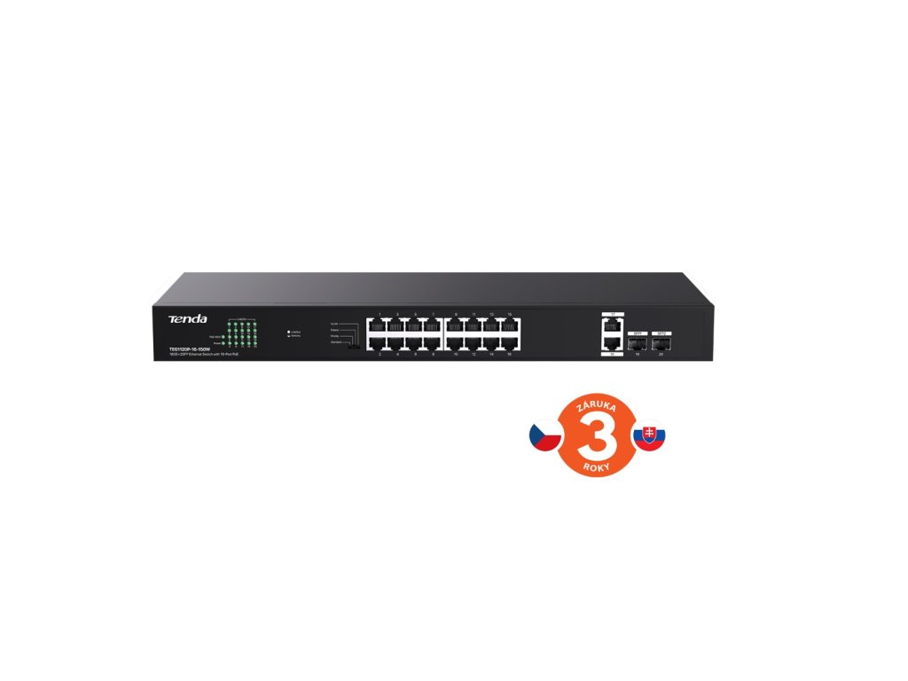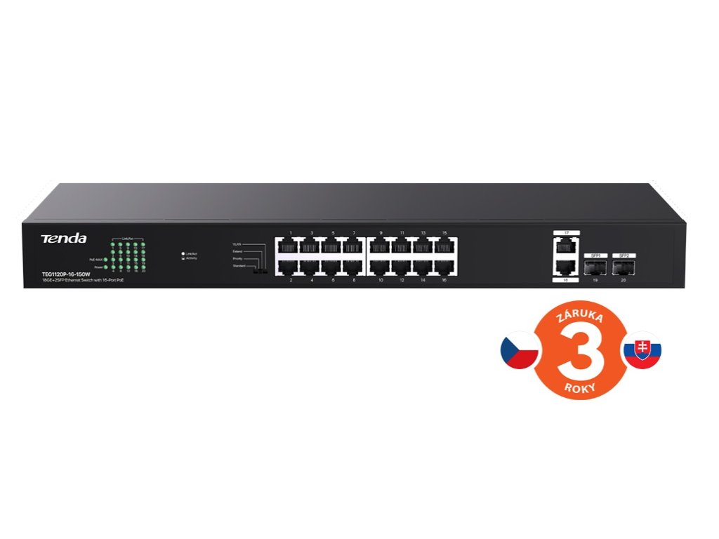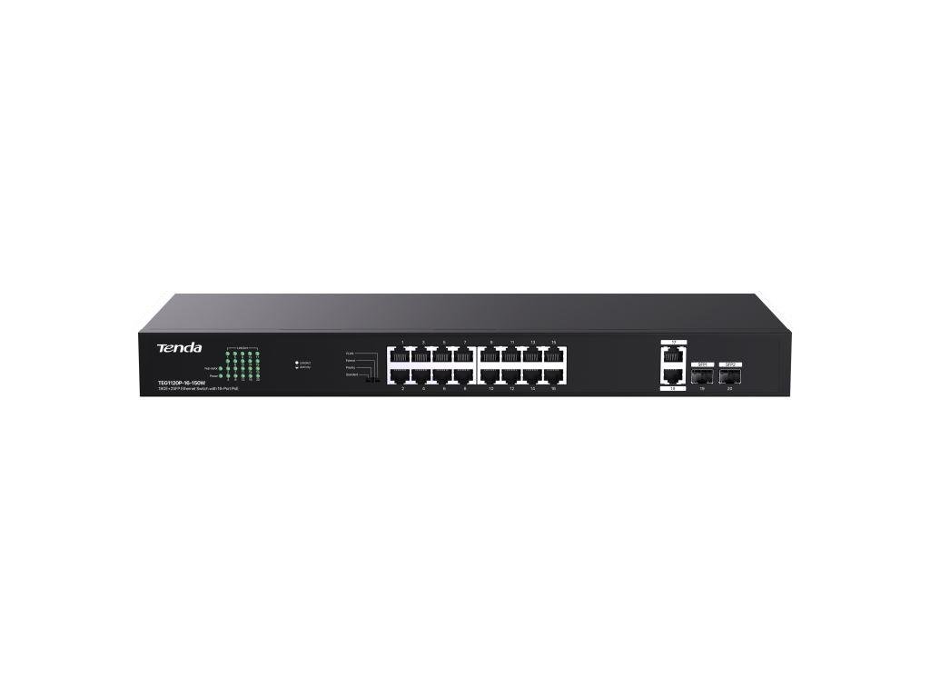 Tenda TEG1120P-16-150W přepíná data pomocí 18ti portů RJ45 a 2x SFP sloty, 16 portů 10/100/1000 Mb/s podporuje PoE802.3af/at. Switch má ochranu proti přepětí 6kV. Podpora přepojování uzlů v módu Store-and-Forward. Full-duplex kontrola toku 802.3x, half-duplex kontrola toku v režimu Back-Pressure.