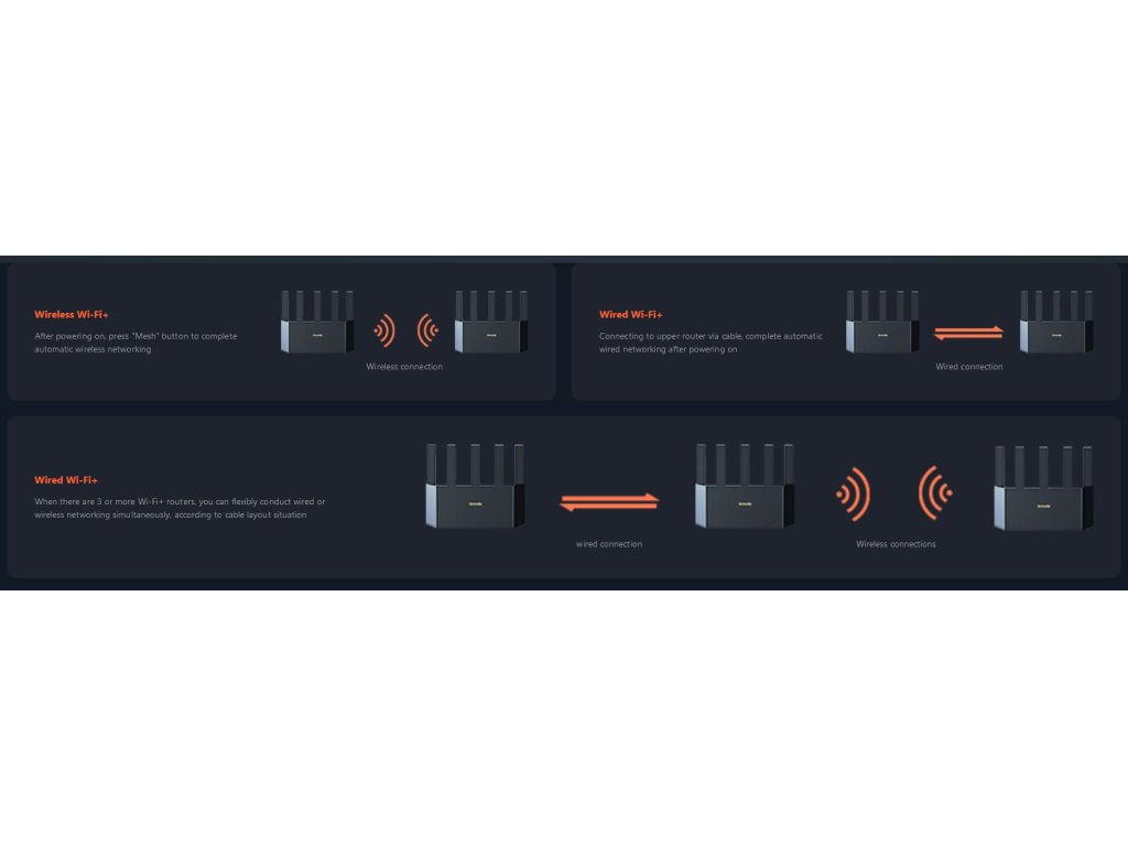 Router podporuje připojení k sítím Mesh pomocí Wi-Fi+ Mesh a je tak možné jej kombinovat s dalšími Tenda Mesh systémy.