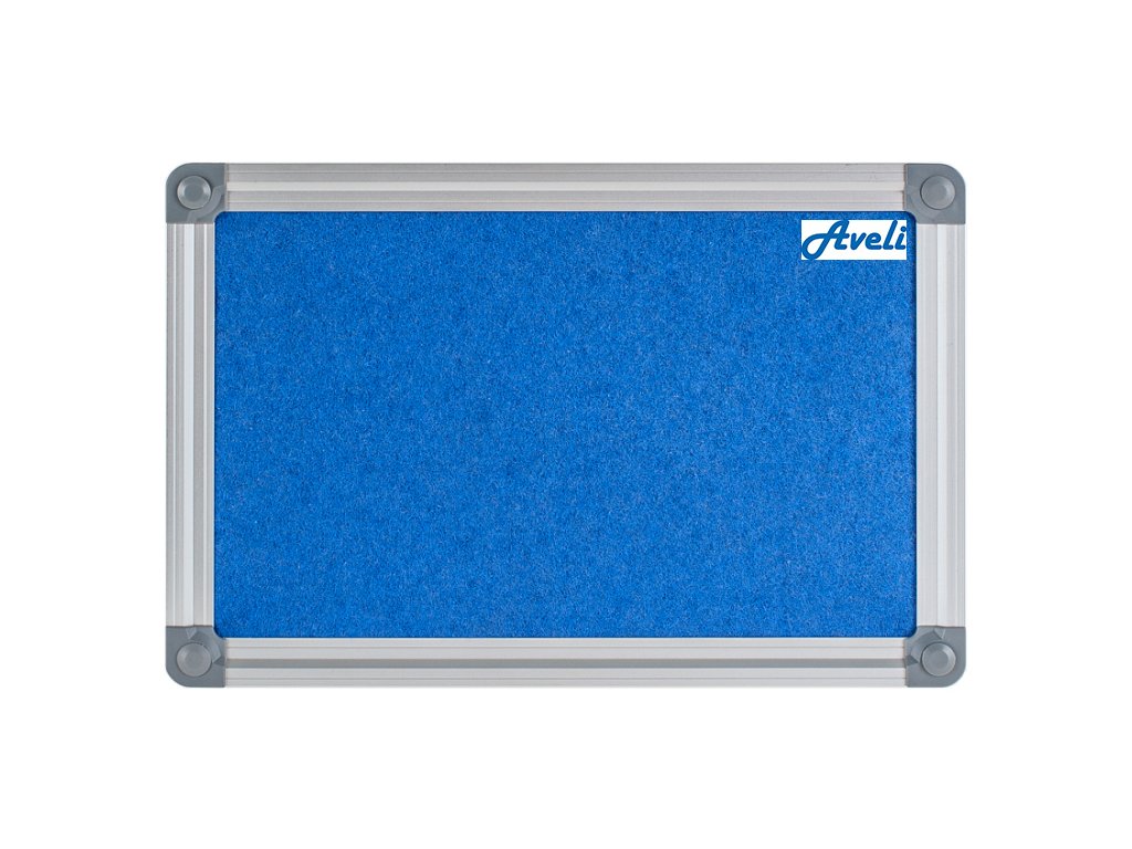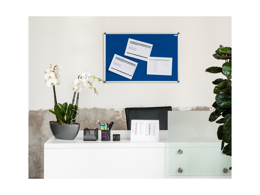Textilní nástěnka v modré barvě s hliníkovým rámem vhodná do prezentačních prostorů, kanceláří, firem i na úřady. Pod textilním povrchem je dřevovláknitá deska, která umožňuje dlouhodobé používání.- Rozměr: 90 x 120 cm