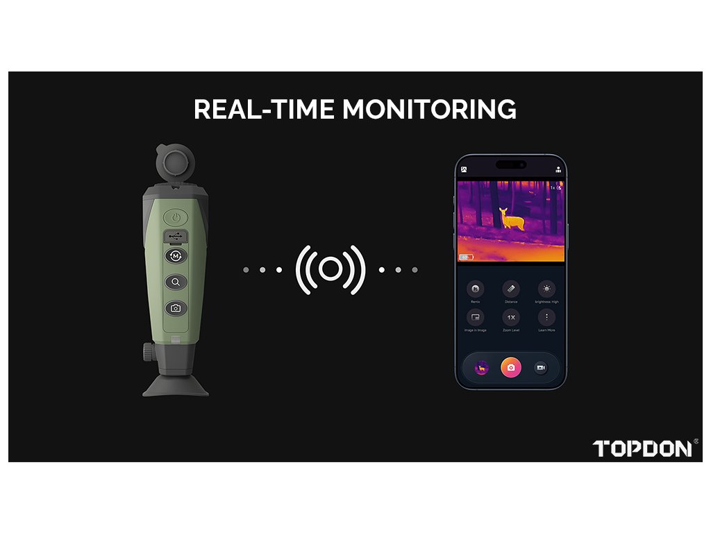 Model TS004 umožňuje bezdrátové připojení k telefonu prostřednictvím aplikace Toplnfrared pro pozorování v reálném čase. Díky ní můžete pořizovat snímky a nahrávat videa se zvukem i bez připojení k internetu.