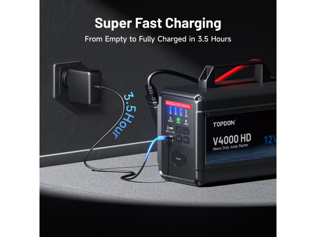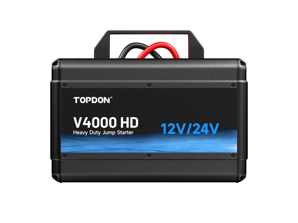 TOPDON V4000HD - profesionální 12V/24V startovací zdroj pro osobní a nákladní vozidlaTOPDON V4000 HD je špičkový startovací zdroj navržený pro nestandartní podmínky. Tento profesionální model zvládá 12V i 24V systémy a je určen nejen pro osobní automobily, ale také pro nákladní vozy, autobusy, stavební techniku a těžká pracovní vozidla.