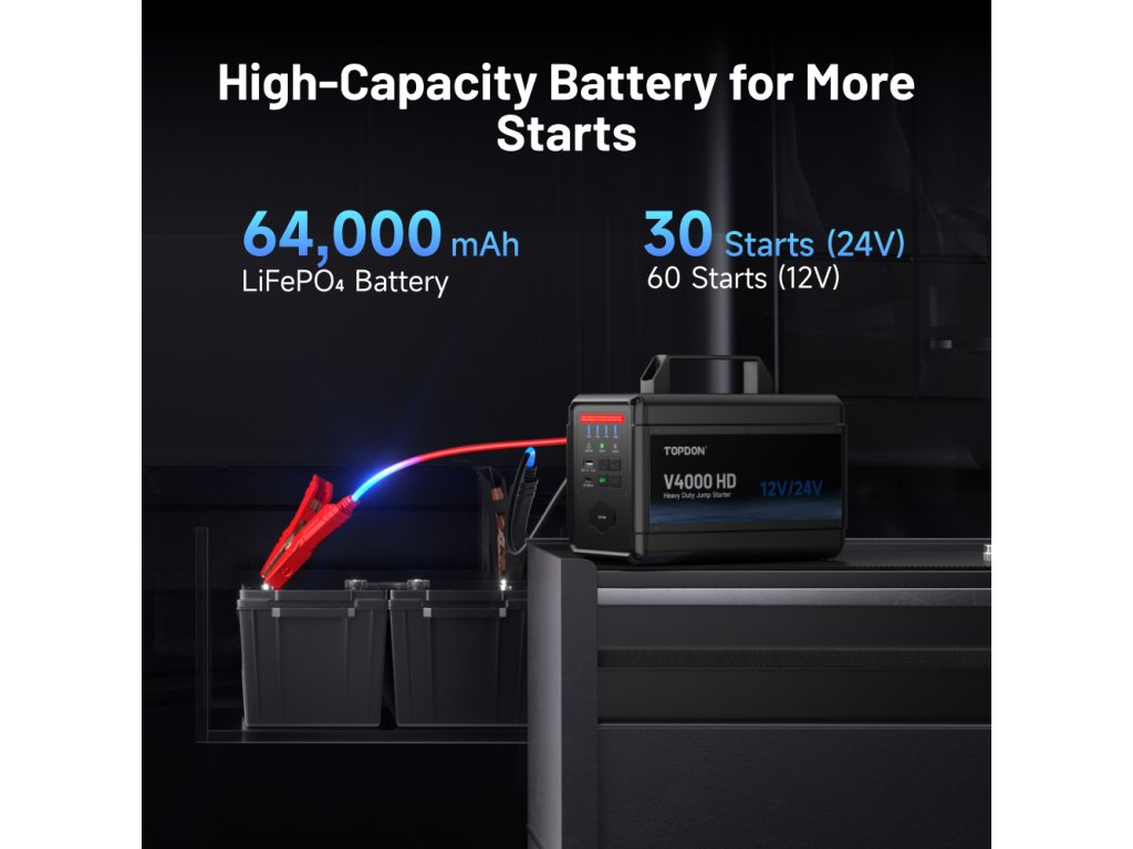 V4000 HD s bezpečnou LiFePO4 baterie s kapacitou 64 000 mAh (204,8 Wh). Ta poskytuje dostatek energie pro opakované starty – až 60 startů u 12V vozidel nebo 30 startů u 24V systémů na jedno nabití.