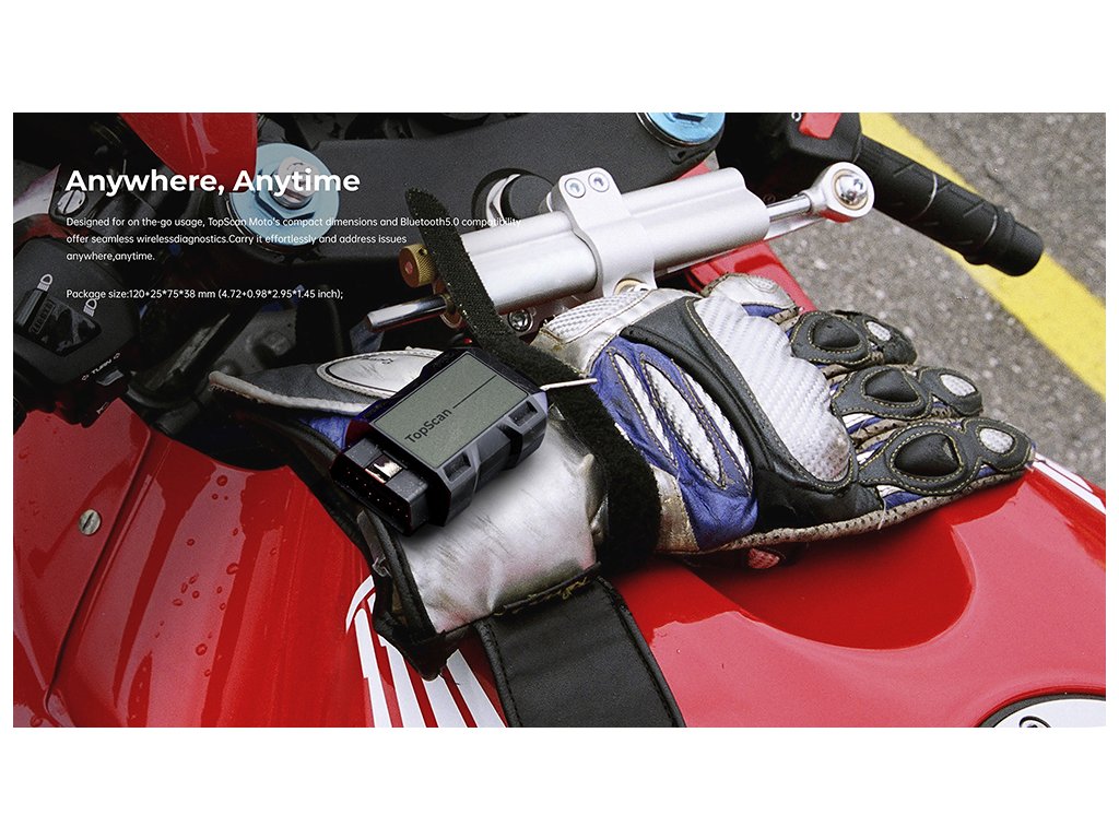 Kompaktní rozměry přístroje TopScan Moto jsou navrženy pro použití na cestách. Kompatibilita s Bluetooth 5.0 nabízí bezproblémovou bezdrátovou diagnostiku, takže se nemusíte obávat zamotaných kabelů nebo omezené mobility. Můžete ji nosit sebou a řešit problémy kdekoli a kdykoli.