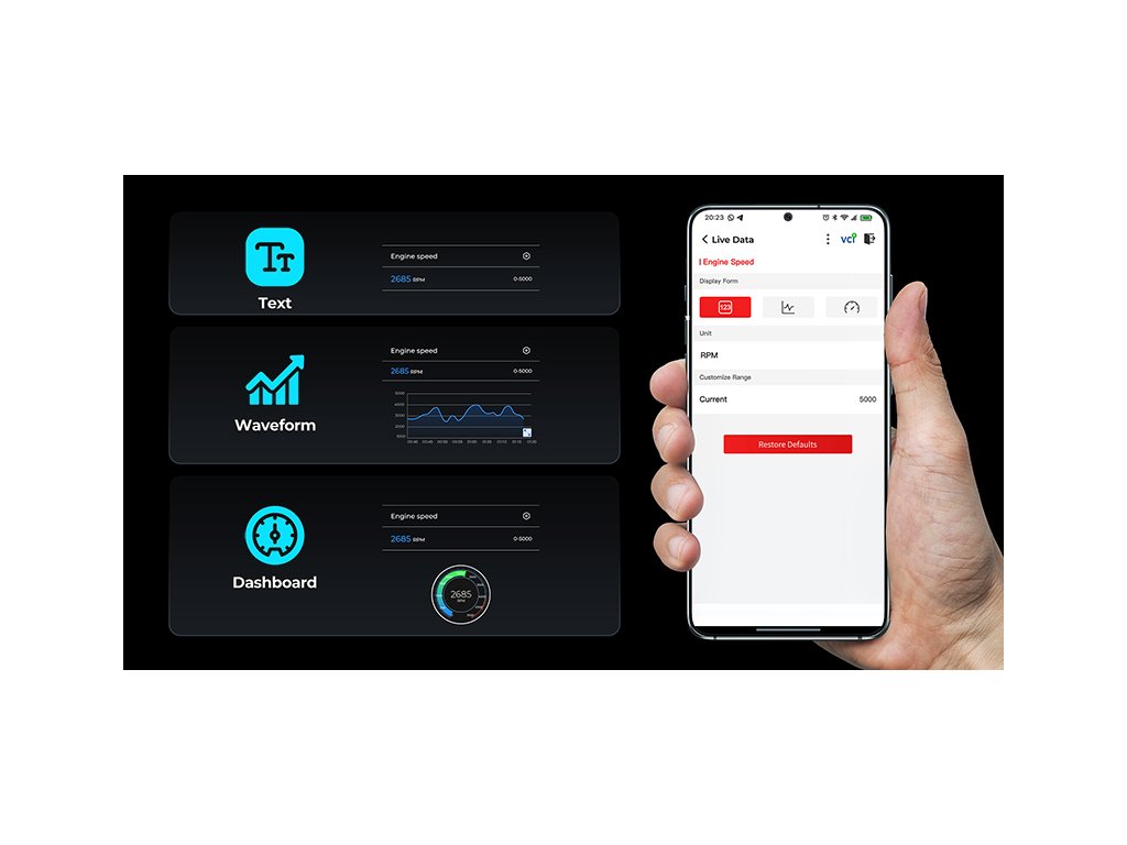 Zobrazení datových toků ve formě textu, grafu nebo grafu podobného přístrojovému panelu. To pomáhá uživatelům intuitivně sledovat změny dat v čase. Použití funkce "Kombinovat" pro grafické zobrazení až 4 datových toků v jednom rozhraní umožňuje uživatelům vyhodnocovat výkonnost pomocí srovnávacích dat a dělat přesná a efektivní rozhodnutí.